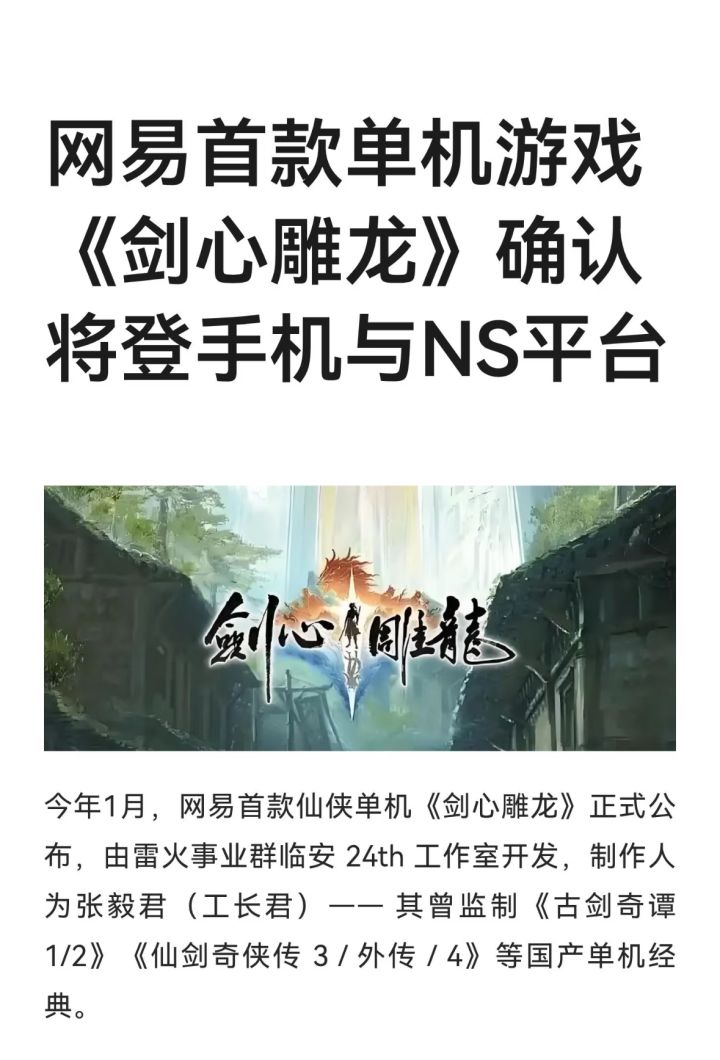 网易仙侠单机《剑心雕龙》由雷火事业群开发,制作人张毅君确认游戏将登陆手机和NS平台,展现团队对品质的追求和对单机游戏初心的坚持。#主机单机 #剑心雕龙