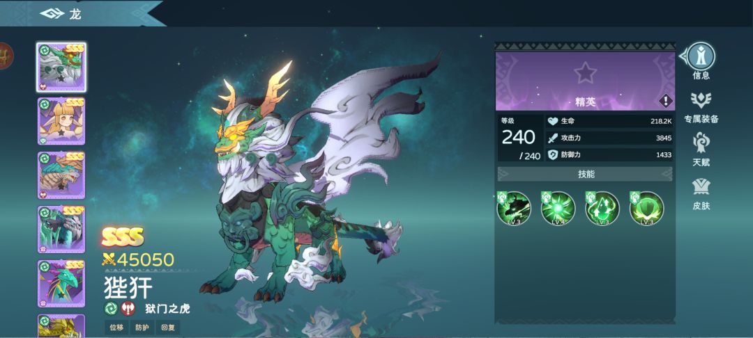 狴犴,又名宪章,中国古代神话中的神兽,也是传说中的龙生九子之第七子。形似虎,平生好讼,却又有威力,狱门上部那虎头形的装饰便是其图像。 一、 四维数据 狴犴的四维数据:攻击3845 暴击伤害 150% 防御1433 血量218200 狴犴定位是个勇猛龙,有一定坦度和较高的伤害。 二、 技能方面 一技能侵袭:主动效果:狴犴嘶吼冲向目标区域,对沿途碰到的敌人造成总计三次,每次240%攻击力的伤害。技能释