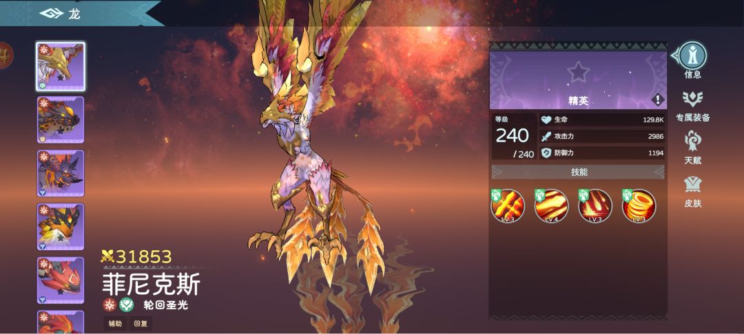 菲尼克斯作为前期辅助主力,在此有必要对其进行说明。 一、 四维数据 菲尼克斯的四维数据:攻击2986 护甲1194 防御1194 血量129800平平无奇的四维图,极其均衡的四维图。 从四维数据上看菲尼克斯所有的数据都不算优秀,当然也说明都不拉胯。 二、 技能方面 一技能轮回之力:菲尼克斯持续吟唱5秒(前3秒自身免疫控制效果),每秒释放一道圣光为友方血量最低的单位回复血量。回血值=菲尼克斯2.5%