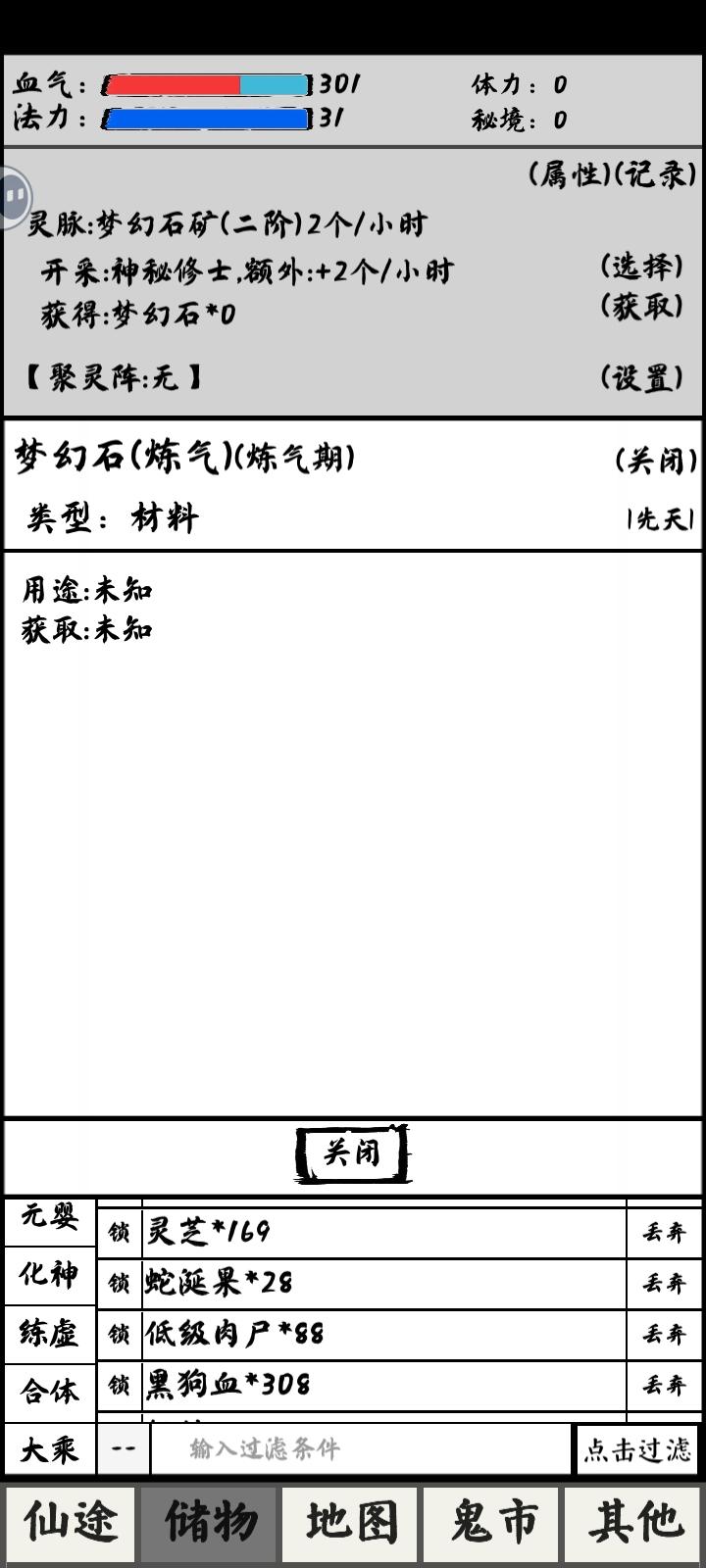 第一,体力会有限制,地图打通就行,等5~6个小时级别上去了自然就能过到青石城,剩下的留给刷材料第二,秘境可以打多倍,但是只有材料是多倍的,修士只有一个,运气点也只有一个第三,优先提升法修,炼体需要花费的资源更多,概率更容易失败第四,炼丹熟练度只有100不要弄多了,上品材料只推荐种植和鬼市获取第五,也是最最重要的一点,筑基丹不要乱吃,也不要点到,练出来最好直接拿去分解卖掉,因为现版本无法消除