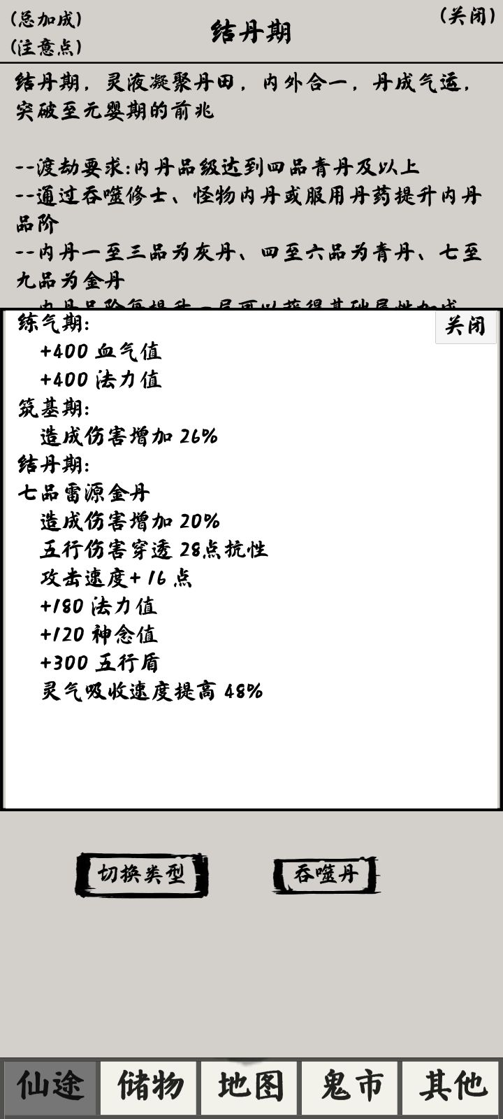 踩完了练气筑基的坑之后进入金丹。金丹开启地府之后可以刷词条,这个阶段主要就是刷装备。地府有5种地图两种刷混魔石的略过boos图boss图可以刷出远古装备还有一种是装备图能刷异魔装这个图左右两边都有装备箱,新手容易忽略。还有黄泉图可以洗装备刷到的装备在黄泉图可以洗,好坏词条都有概率洗出来。好词条装备不建议赌。黄泉能洗出全部辅助品级+1此图亦产出黄泉丹,可加寿命。寿命到头修炼速