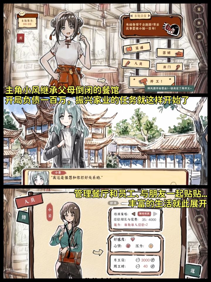 👉一款以中餐厅为背景的模拟经营RPG游戏,开局负债百万经营倒闭多年的餐厅,培养与朋友之间的情感羁绊,一边经营餐厅一边揭开当年餐厅倒闭的秘密。-🔥【妥妥的逆袭流,从打工小妹到餐饮顶流】多种中式菜色齐聚一堂,红烧肉、开水白菜、水煮肉片...,不同菜单搭配将解锁不同成就。买菜算账、招揽顾客、定制策略、研究料理,以还款为目标的全能型老板报道。管理、贴贴两手抓,青梅还是竹马?虽然没有CP结局,但是