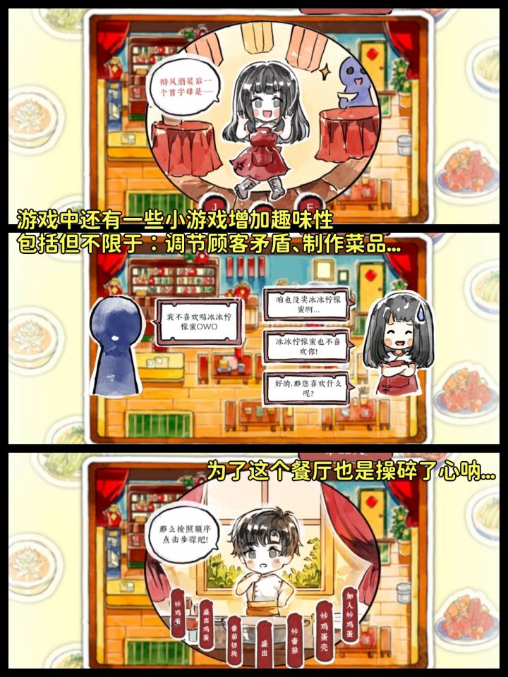 (๑╹◡╹)ノ”大家好我是留老太,这里是我正在独立制作的游戏《醉风酒》。这是一个由我喜欢的“模拟经营”+“角色扮演”题材生长出来的游戏。在游戏里,主角小风将和好朋友们一起经营一家名叫【醉风酒】的中华餐厅,努力还清贷款的同时查明当年破产的真相。作为老板的小风需要精通十八般武艺,经营管理投资是必修功课,揽客查账打扫也要手到擒来。重振醉风酒的同时,更多伙伴也会陆续加入其中,也可以探索他们的故事!如果