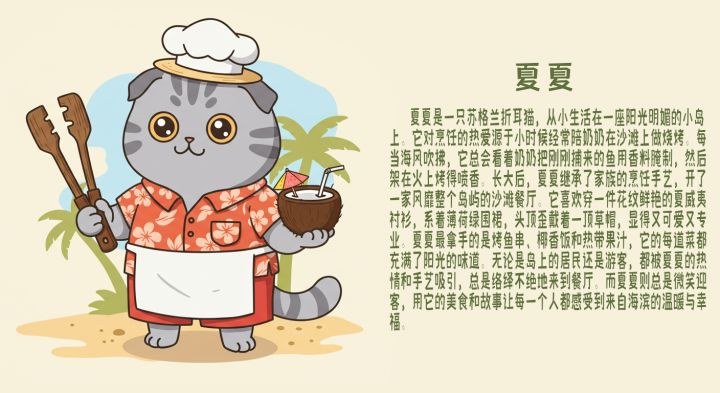 大家好!今天想和大家分享一个超级可爱的角色—— 夏夏,一只来自阳光海滩的苏格兰折耳猫厨师!🌟 角色介绍夏夏是一只性格温暖又充满创意的猫咪,从小生活在一个热带小岛上,对烹饪有着无尽的热爱。它的穿着十分有趣:一件充满夏威夷风情的花衬衫,搭配薄荷绿围裙,再加上一顶俏皮的草帽,整只猫可爱得让人想抱回家!它经营着一家小而温馨的沙滩餐厅,为岛上的居民和游客制作地道的海岛美食。夏夏擅长用简单的食材创造惊艳