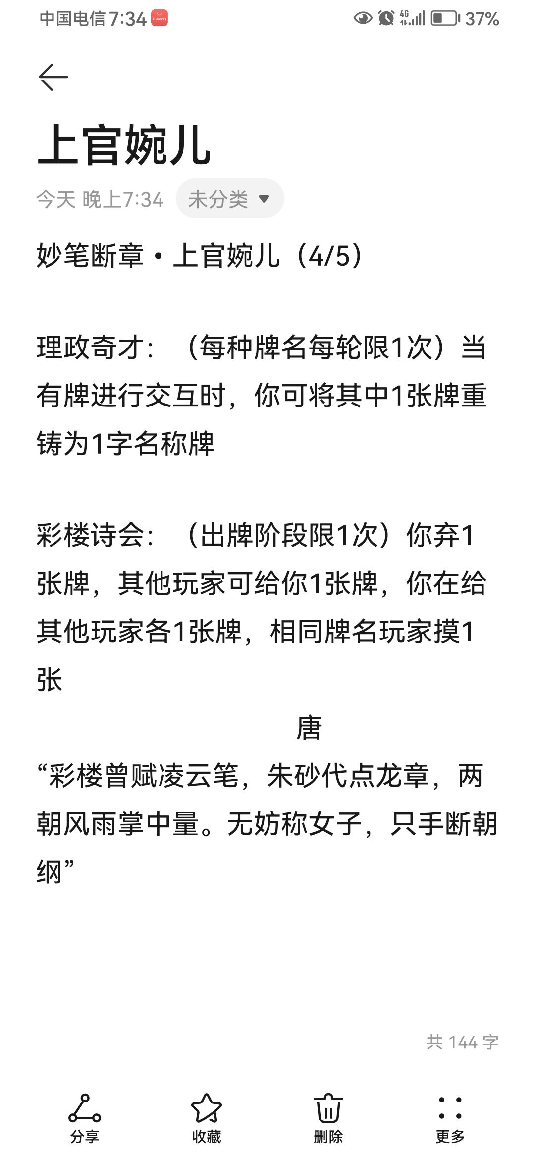 妙笔断章•上官婉儿(4/5) 理政奇才:(每种牌名每轮限1次)当有牌进行交互时,你可将其中1张牌重铸为1字名称牌 彩楼诗会:(出牌阶段限1次)你弃1张牌,其他玩家可给你1张牌,你在给其他玩家各1张牌,相同牌名玩家摸1张 唐 “彩楼曾赋凌云笔,朱砂代点龙章,两朝风雨掌中量。无妨称女子,只手断朝纲”