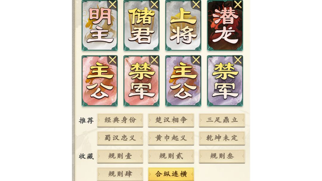 合纵连横,六国合纵御秦,强秦连横破盟。秦国单一一国远强于其余诸侯国,但诸侯国联合起来的国力又胜过秦国,所以诸侯国需要联合起来对抗秦国,而秦国需要破坏诸侯联盟才能最终横扫六合一统天下,故此首先需要一个优势方代表秦国。 这个优势方需要强于其它任意一方,但弱于其它方的联合,根据这个思想,我设定了这套板子。优势方的人数为三人,秦作为表面最强的一方,拥有数量上的优势,但三人的数量,敌不过其余诸侯合众一心的