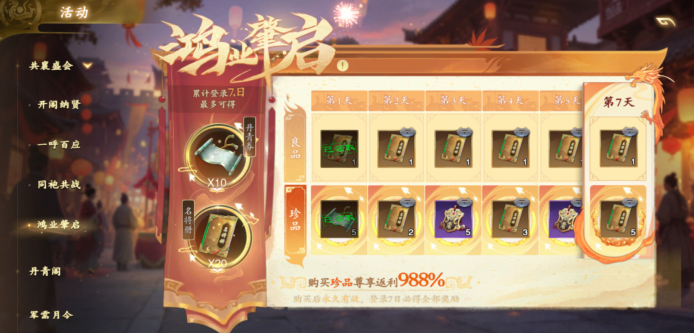 一看到988%直接买了,无条件信任,结果买完一算发现上当了。1.册子数量对不上,最多20个册子是怎么算出来的?莫名其妙的2.问鼎令10个算27,册子10个算16,丹青10个算32。平时75就拿下的现在68捆绑购买,这活动有什么必要吗3.说是返利988%,我不知道这个返利是怎么算的,怎么算都算不到988,最亏的算150元买问鼎令200元买丹青和册子,除以68也才514%。你要是后面再返6000