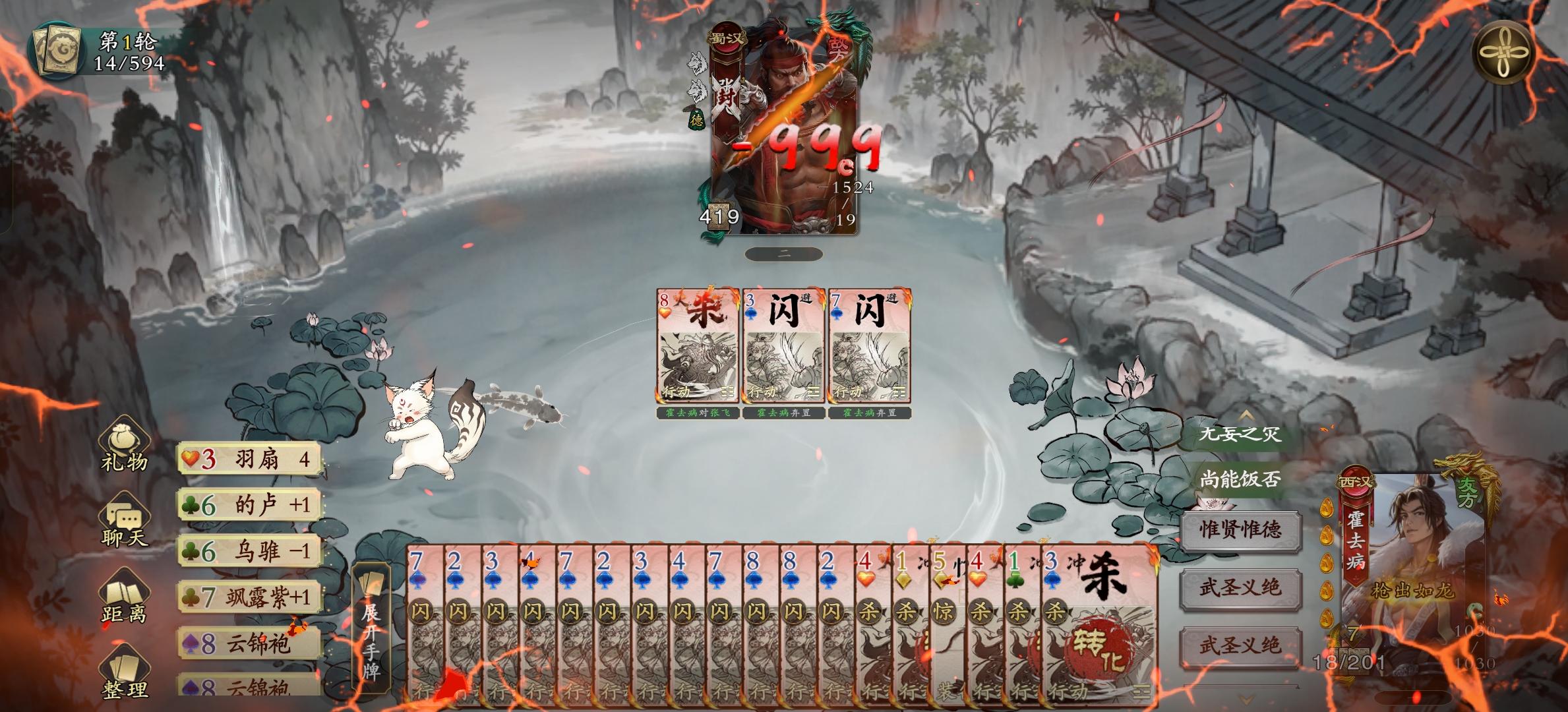 庞统 5手牌 3体力上限 蜀汉 传说铁索连舟你可以将♦️牌当作连环打出。当处于连环状态的角色受到属性伤害时,你摸1张牌。浴火重生阵亡,若你的阵营未失败,你进入涅槃状态。(涅槃状态:每个回合开始时,卜卦,若为♥️,则你重新登场。)*涅槃状态下,庞统阵亡,但是玩家不退场。*如果庞统阵亡时,自己的阵营失败了,就不会进入涅槃状态。这种情况比较多,比如2V2仅剩自己的时候,身份模式自己是最后1