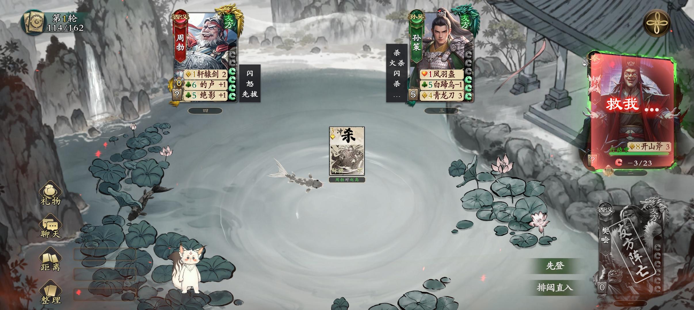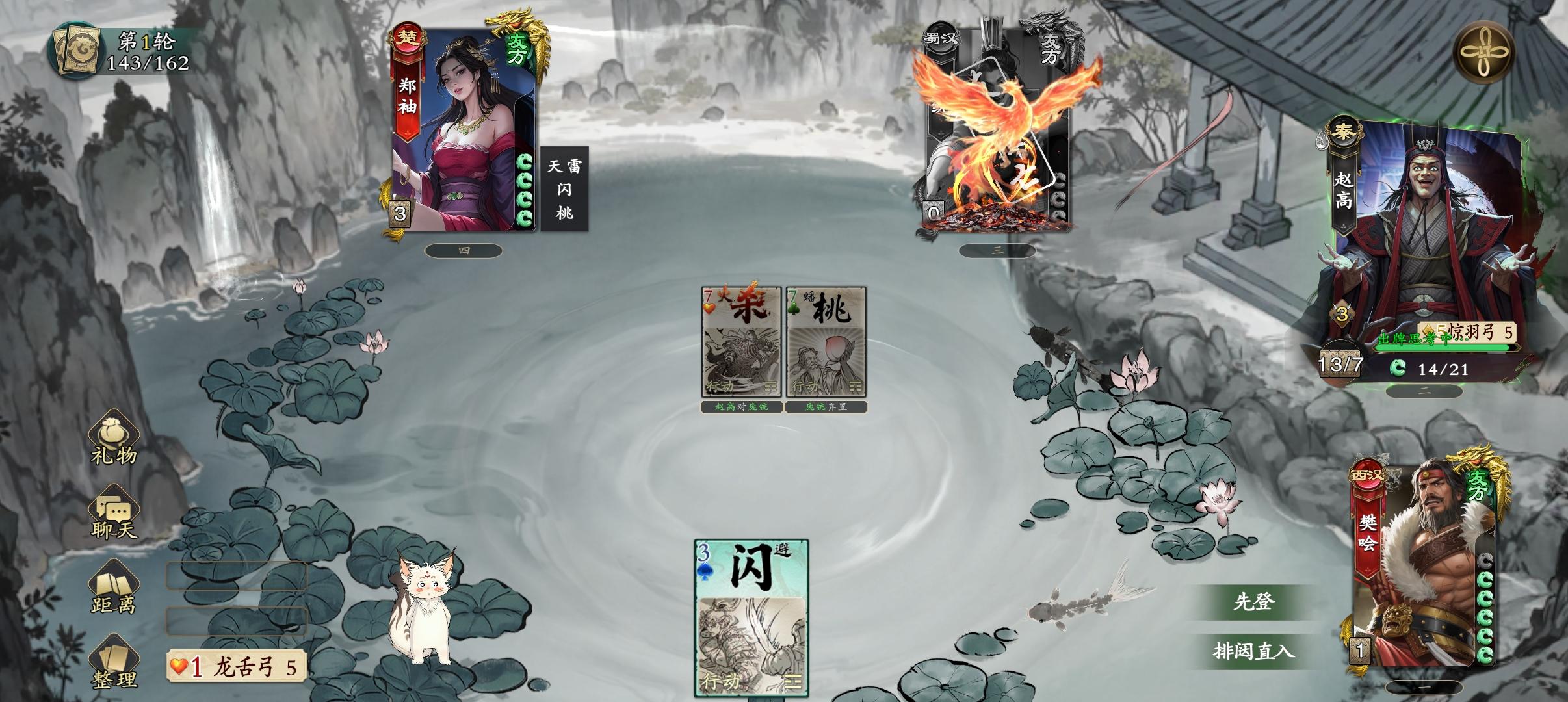 庞统 5手牌 3体力上限 蜀汉 传说铁索连舟你可以将♦️牌当作连环打出。当处于连环状态的角色受到属性伤害时,你摸1张牌。浴火重生阵亡,若你的阵营未失败,你进入涅槃状态。(涅槃状态:每个回合开始时,卜卦,若为♥️,则你重新登场。)*涅槃状态下,庞统阵亡,但是玩家不退场。*如果庞统阵亡时,自己的阵营失败了,就不会进入涅槃状态。这种情况比较多,比如2V2仅剩自己的时候,身份模式自己是最后1