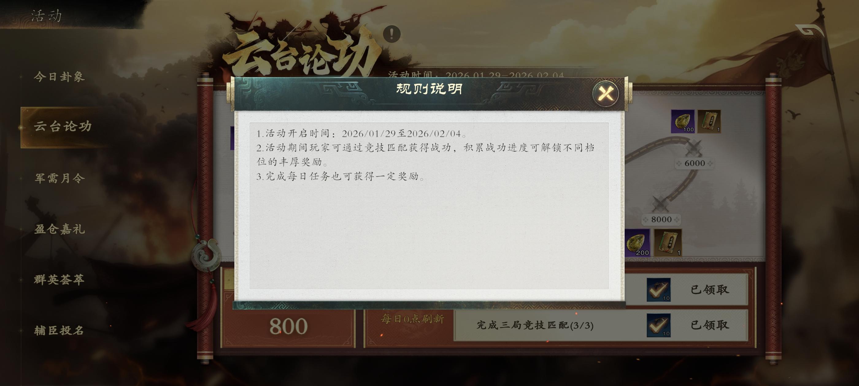强制要求竞技匹配,胜利加分失败扣分,也就是必须上8000分才能拿满奖励,牢玩家都18000杯了,谁还会打这个?活动不要出的这么恶心谢谢,包括上一个版本的答题也挺变态的#名将杀
