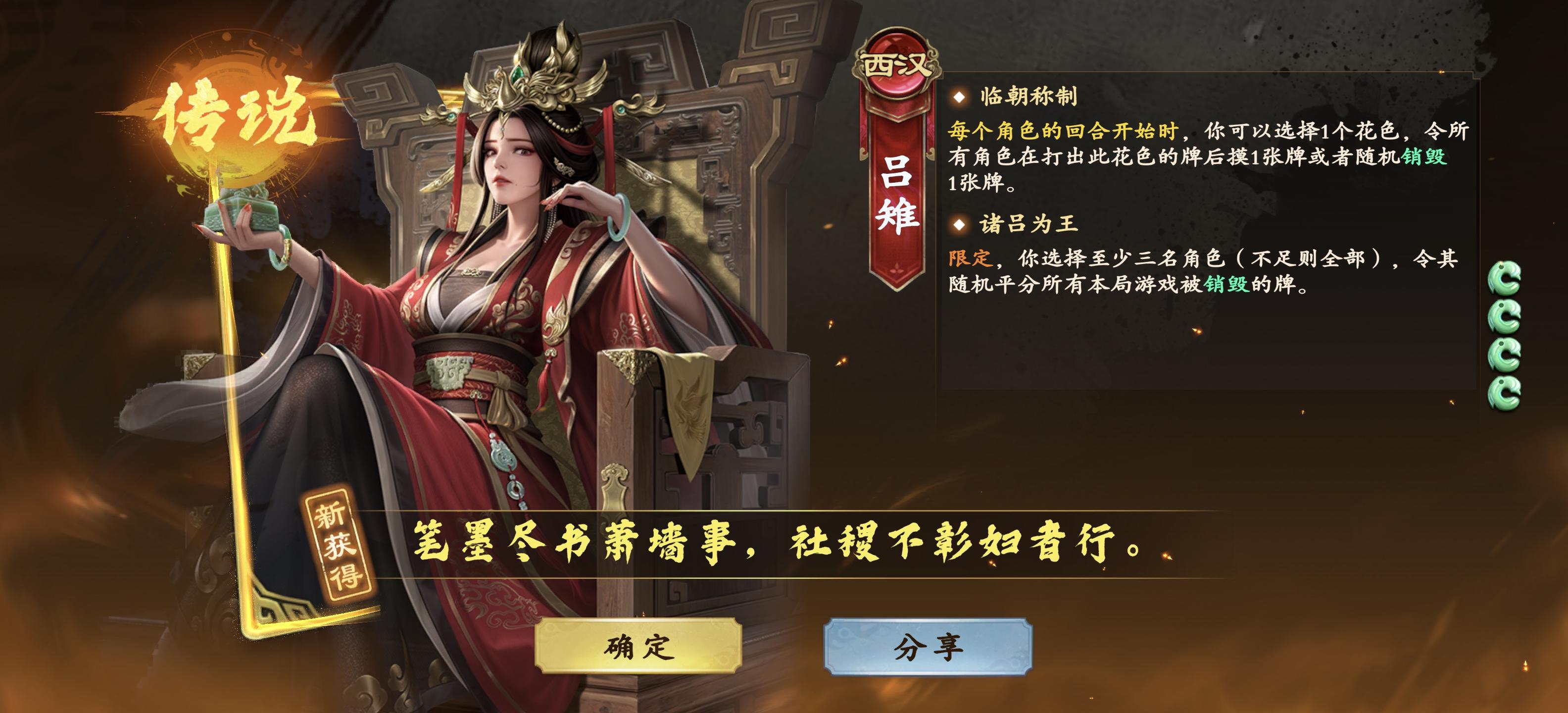 朱买臣 西汉 3/6买臣负薪:当你获得♣️牌时,可弃置此牌当作使用任意1张行动牌。锦衣夜行:出杀/应战,若你的装备区域内有防具,摸与你防具数量相同的牌。覆水难收:出牌阶段,可交给1名其他角色任意张♠️牌,你摸相同数量的牌,然后其本轮无法弃置和使用此牌。
