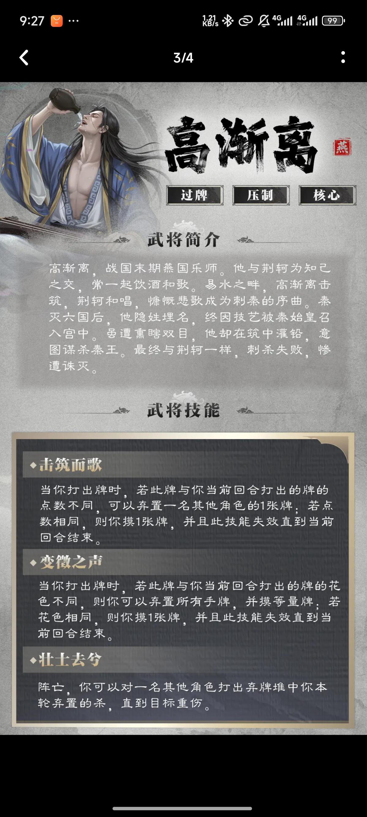 高渐离 5手牌 4体力上限 燕 稀有击筑而歌当你打出牌时,若此牌与你当前回合打出的前1张牌的点数不同,可以弃置一名其他角色的1张牌;若点数相同,则你摸1张牌,并且此技能失效直到当前回合结束。变徴之声当你打出牌时,若此牌与你当前回合打出的前1张牌的花色不同,则你可以弃置所有手牌,并摸等量牌;若花色相同,则你摸1张牌,并且此技能失效直到当前回合结束。壮士去兮阵亡,你可以对一名其他角色打出弃