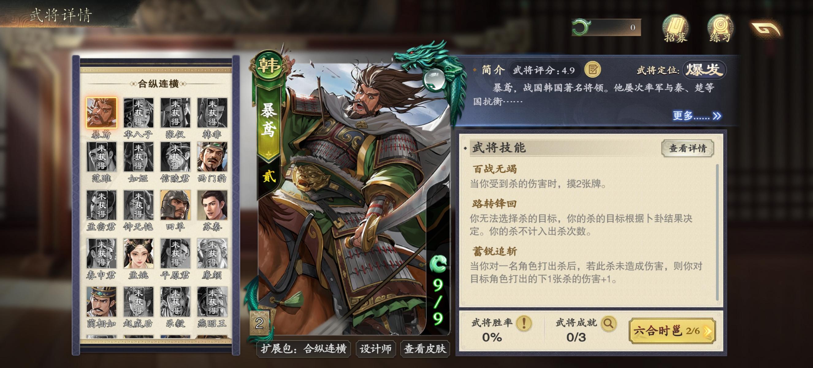 钟会 5手牌 4体力上限 曹魏 稀有精练策数每名角色的回合结束时,若你于本回合使用/失去过牌,则你摸/弃一张牌,若你的手牌因此变为全场唯一最多/少,则本技能额外执行一次。挟术伪诏回合开始时,你展示一张手牌,然后令其他角色同时展示一张手牌,然后你获得等同于与你展示手牌相生数量的“调兵遣将”,与你展示手牌相克的角色手牌视为杀直到本回合结束。庞德 3手牌 6体力上限 曹魏 稀有抬棺蹈难每轮