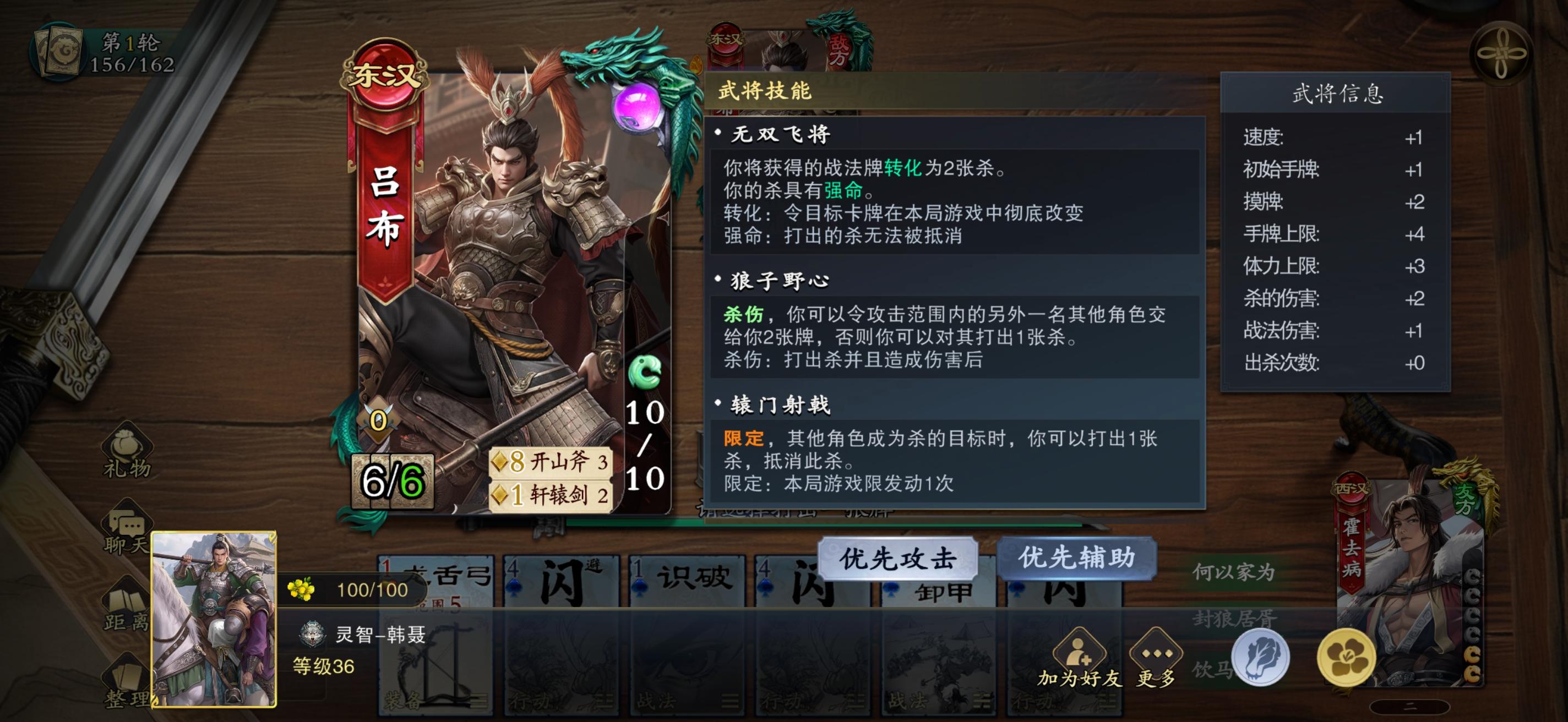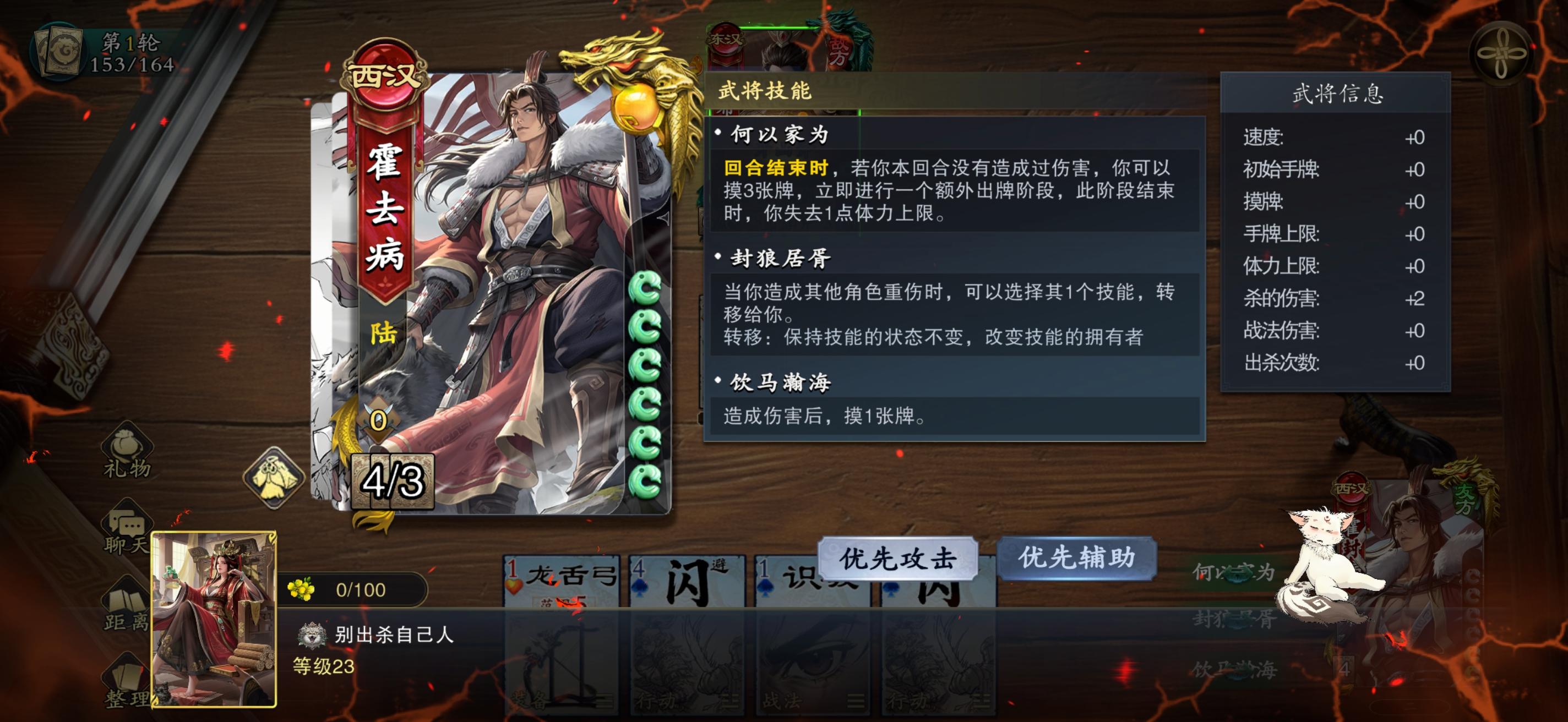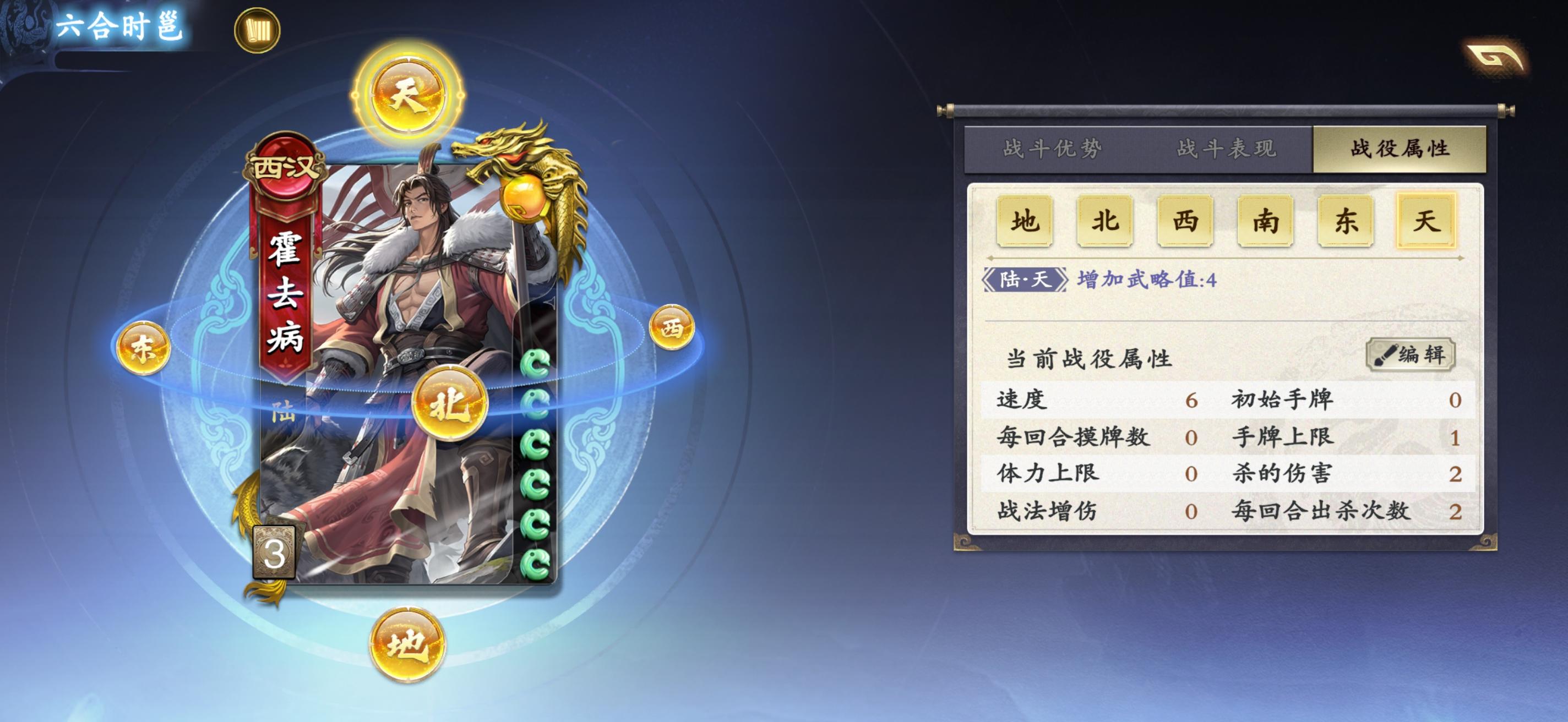 满阶霍去病,速度6,手牌+1,连开两把千里,都是对面先手,而且我手牌上限都是3,但是奇怪的是出杀次数和杀伤有效