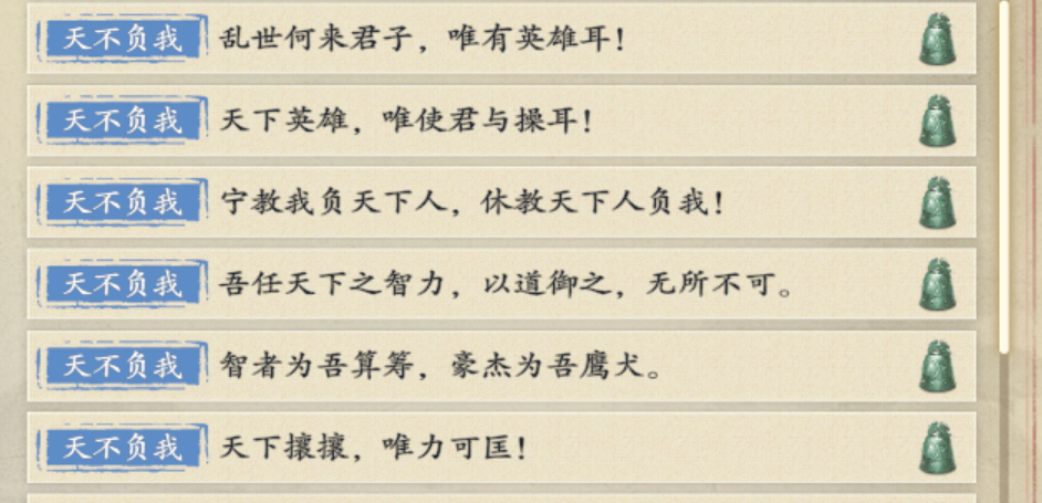 前言:名将杀中一般情况,一个技能有两条配音。但也有很多技能有多条配音,原因是因为一个技能有不止一个效果(举例郭嘉天妒卜卦成功和失败分别有两条配音,子婴末代秦王触发开局双倍手牌有两条,触发丢牌给牌有额外两条语音)但有些武将的技能,虽然有配音但游戏内不播放,有些是因为bug(内测还有公测就没了),也有些可能是故意这么做的?也可能有些压根是程序员懒。1.曹操,曹操天不负我是有六条语音的,但游戏内只