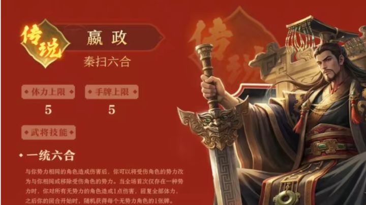 《名将杀》全新版本·【秦扫六合】即将上线!将军们好:以下为2月12日停服更新内容停服时间为上午05:00-06:00。感谢您对《名将杀》的持续支持,抱歉影响将军游戏,停服结束后我们会邮件给将军们发放补偿。【新增武将】(嬴政,王翦将在赛季更新后上线)嬴政——5手牌 5体力上限 秦 传说一统六合:与你势力相同的角色造成伤害后,你可以将受伤角色的势力改为与你相同或移除受伤角色的势力。当全