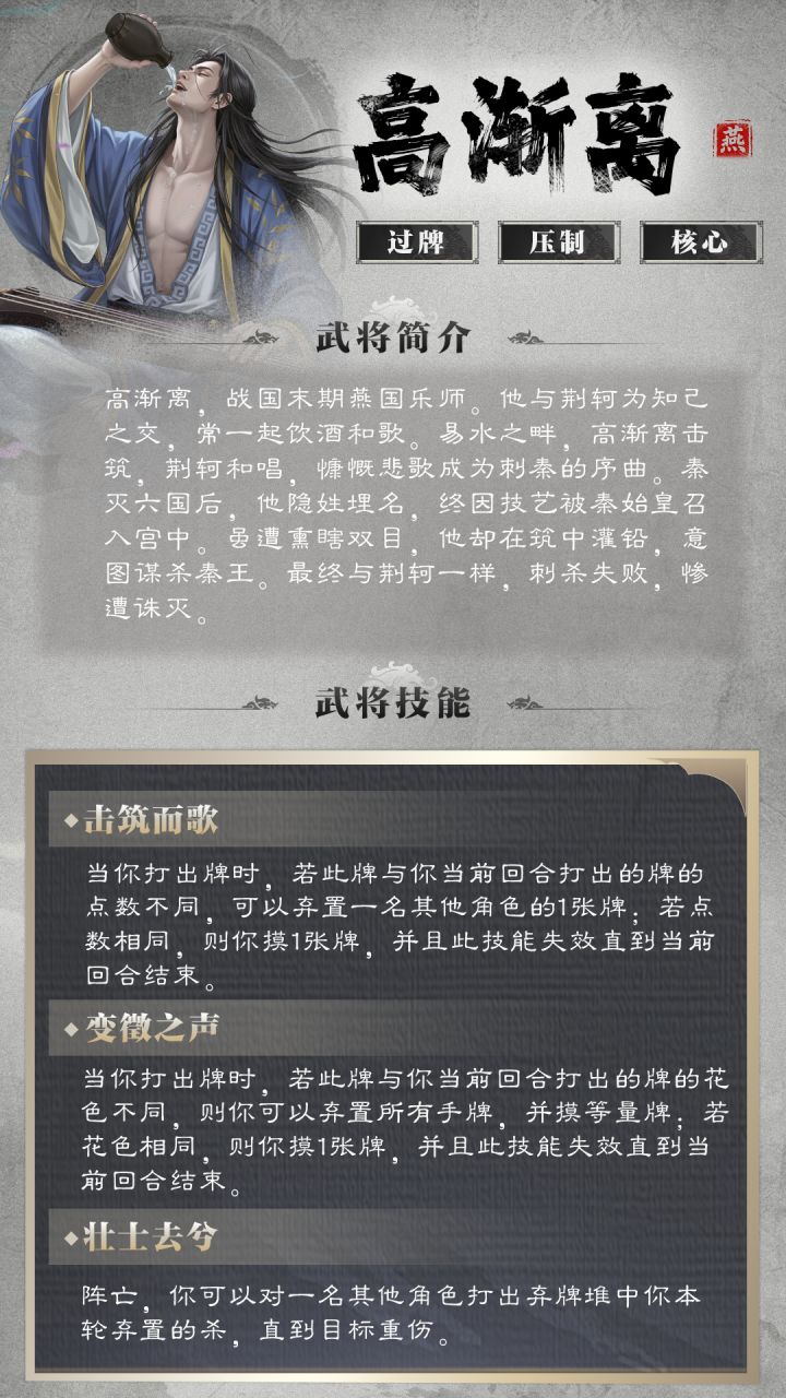 高渐离 5手牌 4体力上限 燕 稀有击筑而歌当你打出牌时,若此牌与你当前回合打出的前1张牌的点数不同,可以弃置一名其他角色的1张牌;若点数相同,则你摸1张牌,并且此技能失效直到当前回合结束。变徴之声当你打出牌时,若此牌与你当前回合打出的前1张牌的花色不同,则你可以弃置所有手牌,并摸等量牌;若花色相同,则你摸1张牌,并且此技能失效直到当前回合结束。壮士去兮阵亡,你可以对一名其他角色打出弃