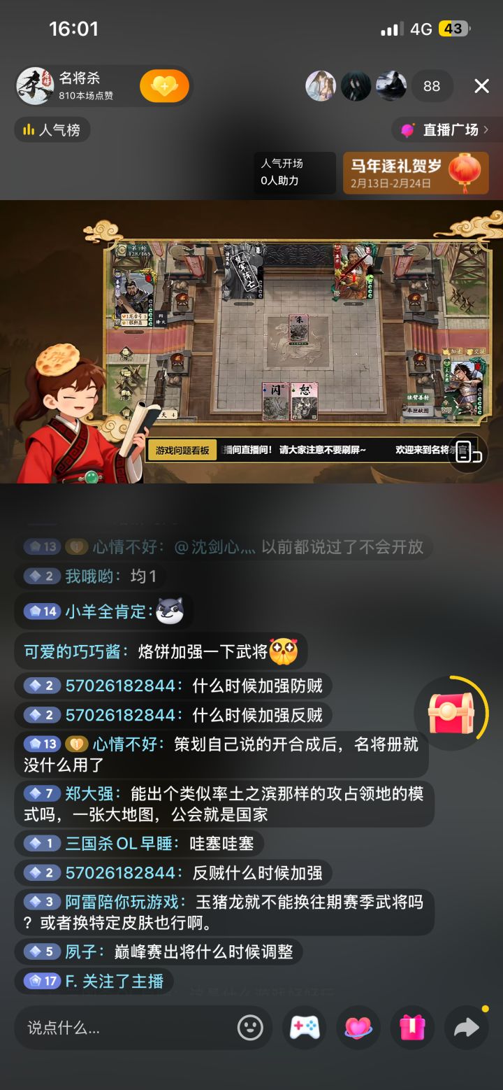 1. 巅峰赛卡将不公平,这是极度影响全扩玩家体验的最佳解决方案:共用将池,进行bp决定阵容临时解决方案:提高准入门槛(拥有90%的将才能巅峰赛)2. 录像不能前进后退,只能干巴巴看完;录像不能更换视角,看不到他人手牌3. 斗地主城主类型过多,对新玩家极度不友好,建议每天轮换一城主4. 斗地主建议确定好身份选将后再刷牌,降低方差