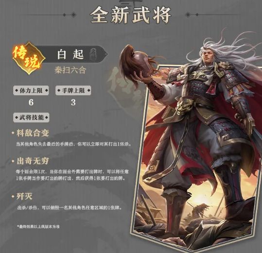 本周新武将尉缭 5手牌 4体力上限 秦 史诗挟义而战当有角色受到伤害后,你可以选择增强其1张手牌。天官兵谈你无法卜卦;其他角色卜卦后,你获得1张♣牌。战威攻权当你打出增强牌时,可以弃置一名其他角色任意区域的1张牌。*无法卜卦的效果是指不会执行卜卦的动作,所有需要执行卜卦才生效的后续效果也不会生效。(也就是“卜卦***,然后”这样描述中,“然后”后面的效果不会生效)下赛季战令武将