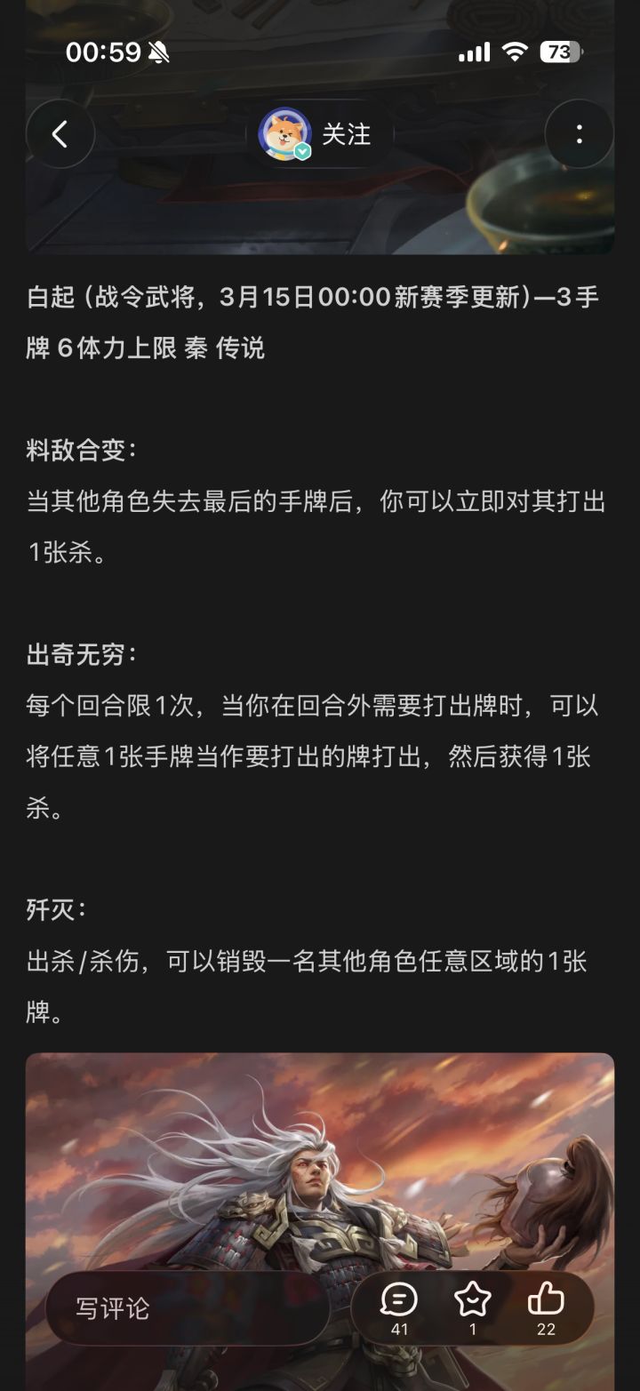 有人说特别强,有人说特别弱。我来分析分析在每回合不断杀的情况下,很强,杀伤可以销两张,但是白起摸牌白呀,很难不断杀,断杀回合内基本等于白板。再说回合外,又分两种。进攻,条件有点苛刻,需要敌人打光手牌,但是能克制张骞,陆逊,孙权,夏侯之类的,和残血有一张桃的敌人,吃完桃能补刀,算是有一定强度。防守,那就有厉害了,类似于有徐州城主buff的陈平,杀和战法牌很难打进去,多刀和强命的武将好打一些。