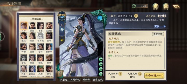 新武将黄月英 4手牌 4体力 蜀汉 稀有巧手匠心出牌阶段限1次,你可以选择1张手牌或场上任意1张装备牌,获得1张此牌的复制。奇智佐谋你主动打出的战法牌生效2次,每种战法牌每回合限1次。王异 4手牌 4体力 曹魏 稀有忠贞刚烈回合结束时,你可以令一名其他角色的手牌数或者体力值变为与你相同,若其手牌数或者体力值因此改变>=2,你受到1点伤害。 舍子全义受伤,令一名角色弃置所有手牌,