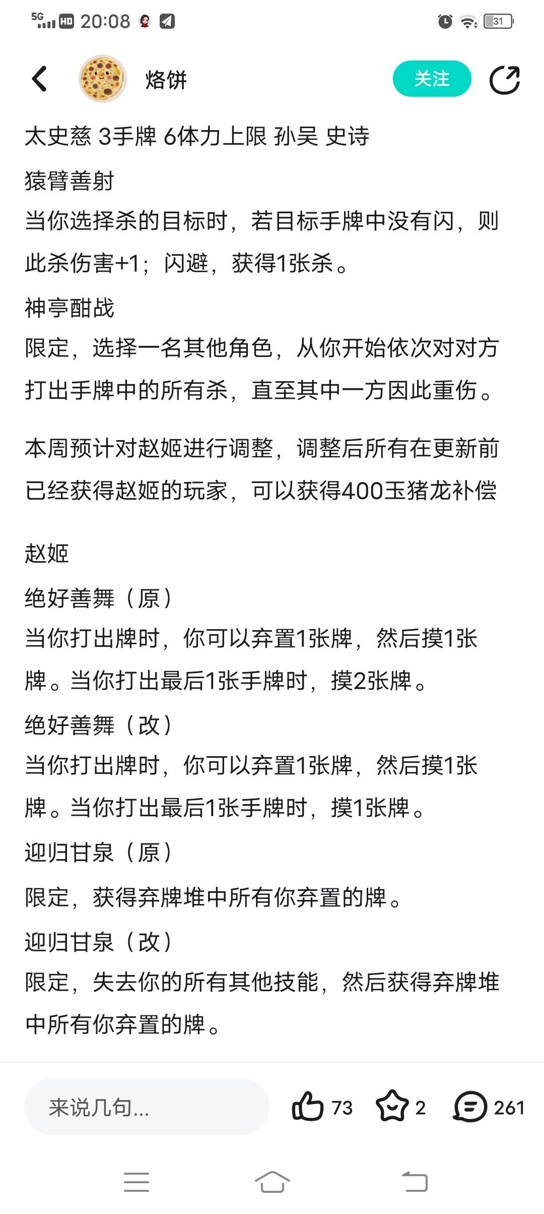 (个人看法)先说太史慈,又一个加伤武将,让人没有玩的欲望,黄忠跟太史慈选,我宁愿玩黄忠赵姬改的没到位,应该限制过牌数才行,每回合花色或者牌类型。实在不行,让玩家来设计吧,官方从玩家手里选几款武将设计,最后玩家自己来投票。