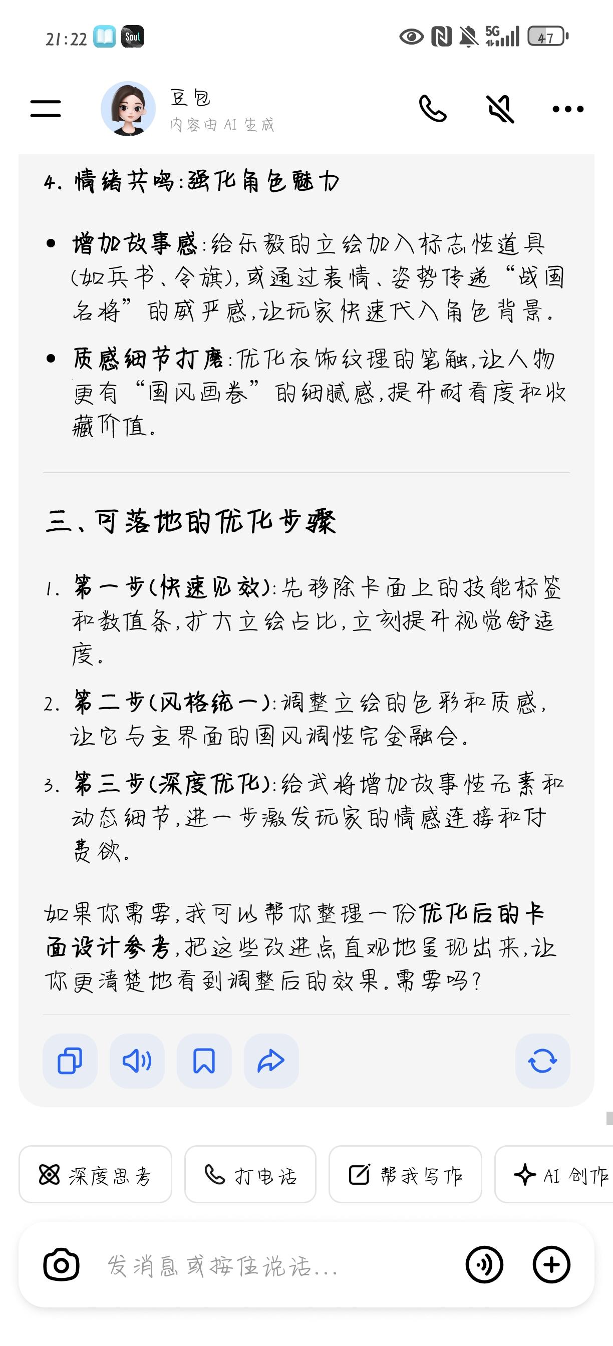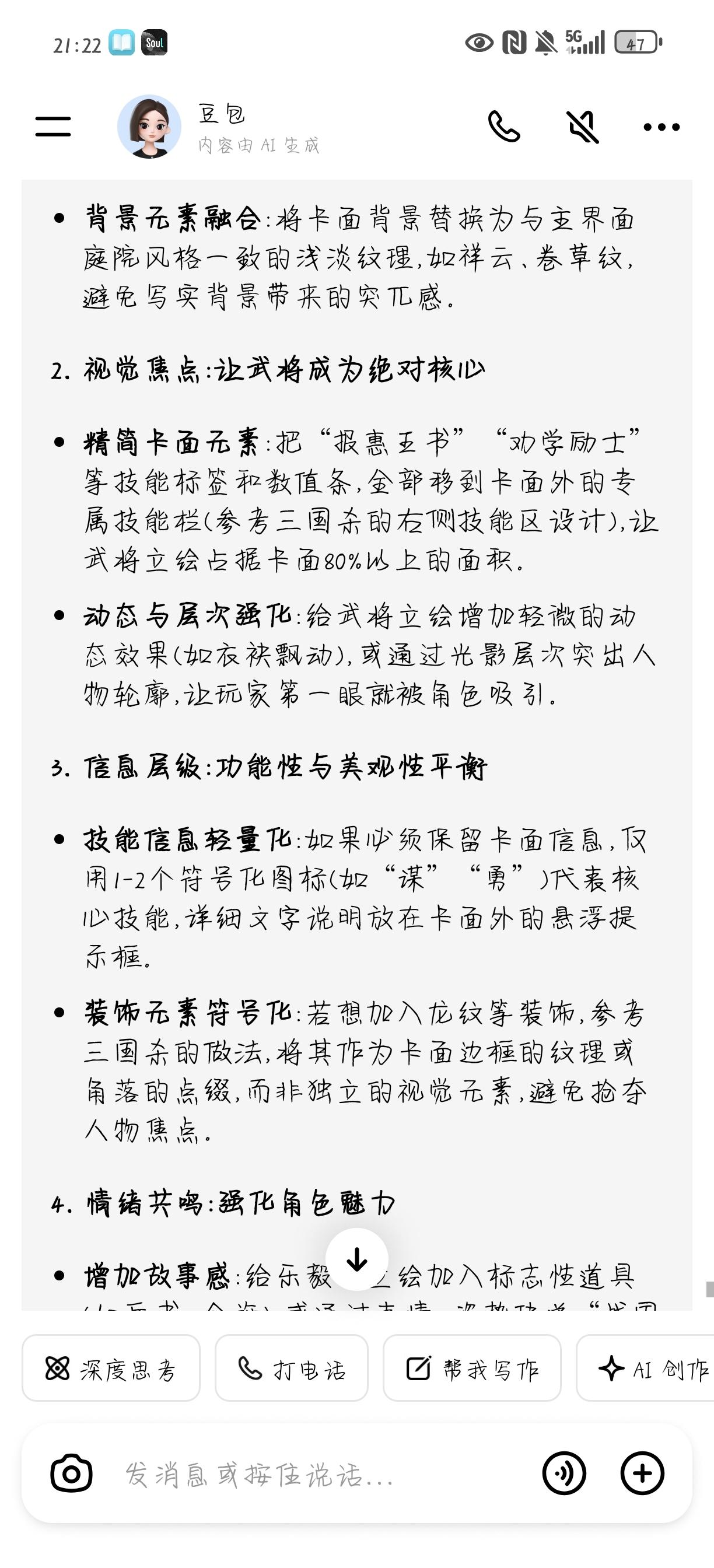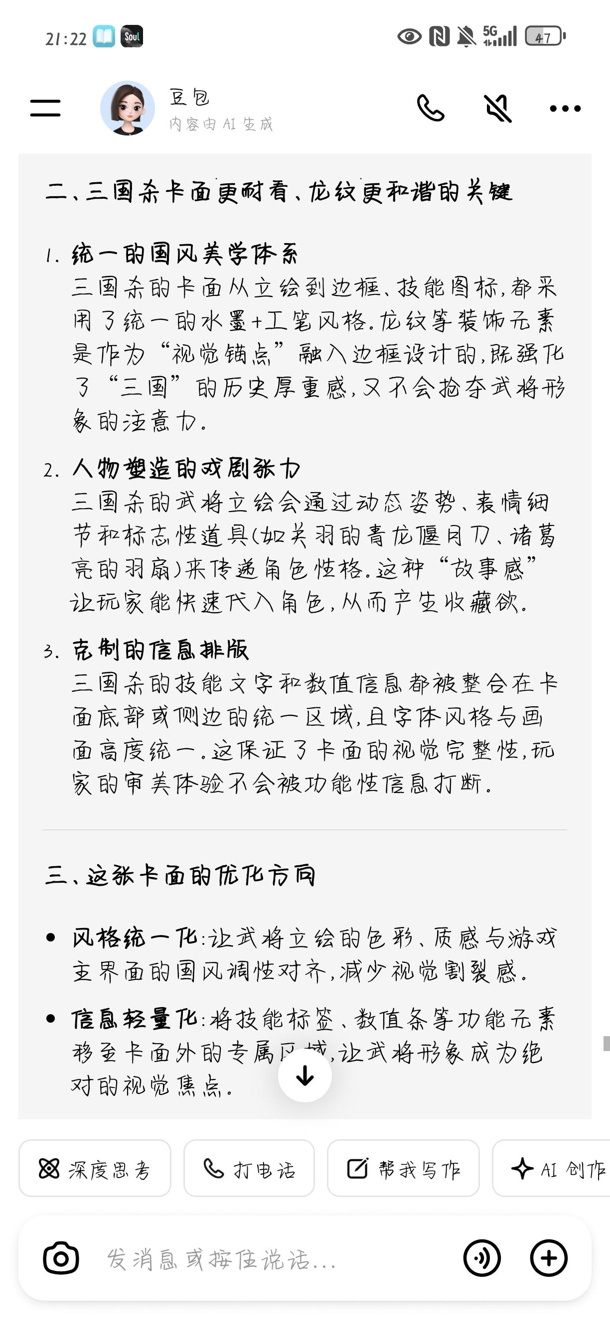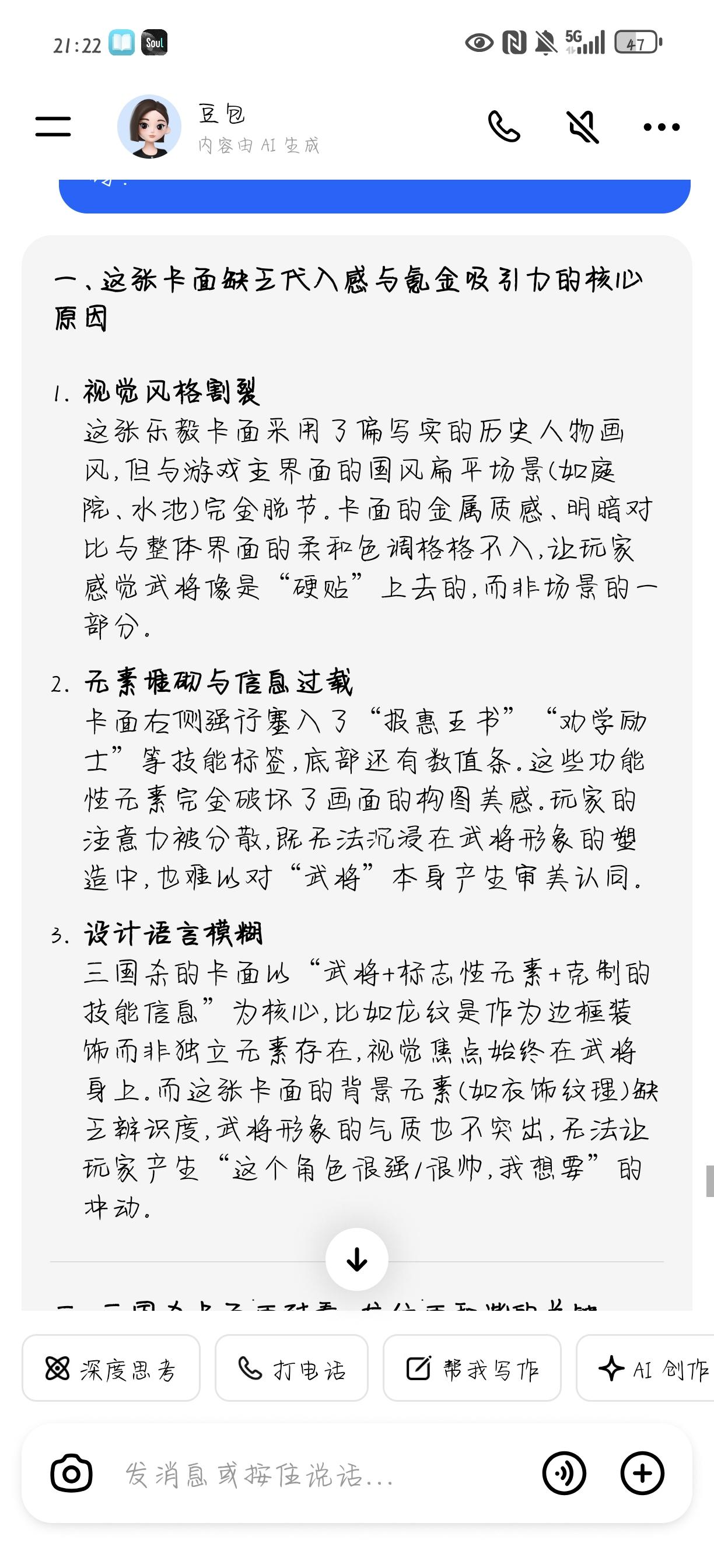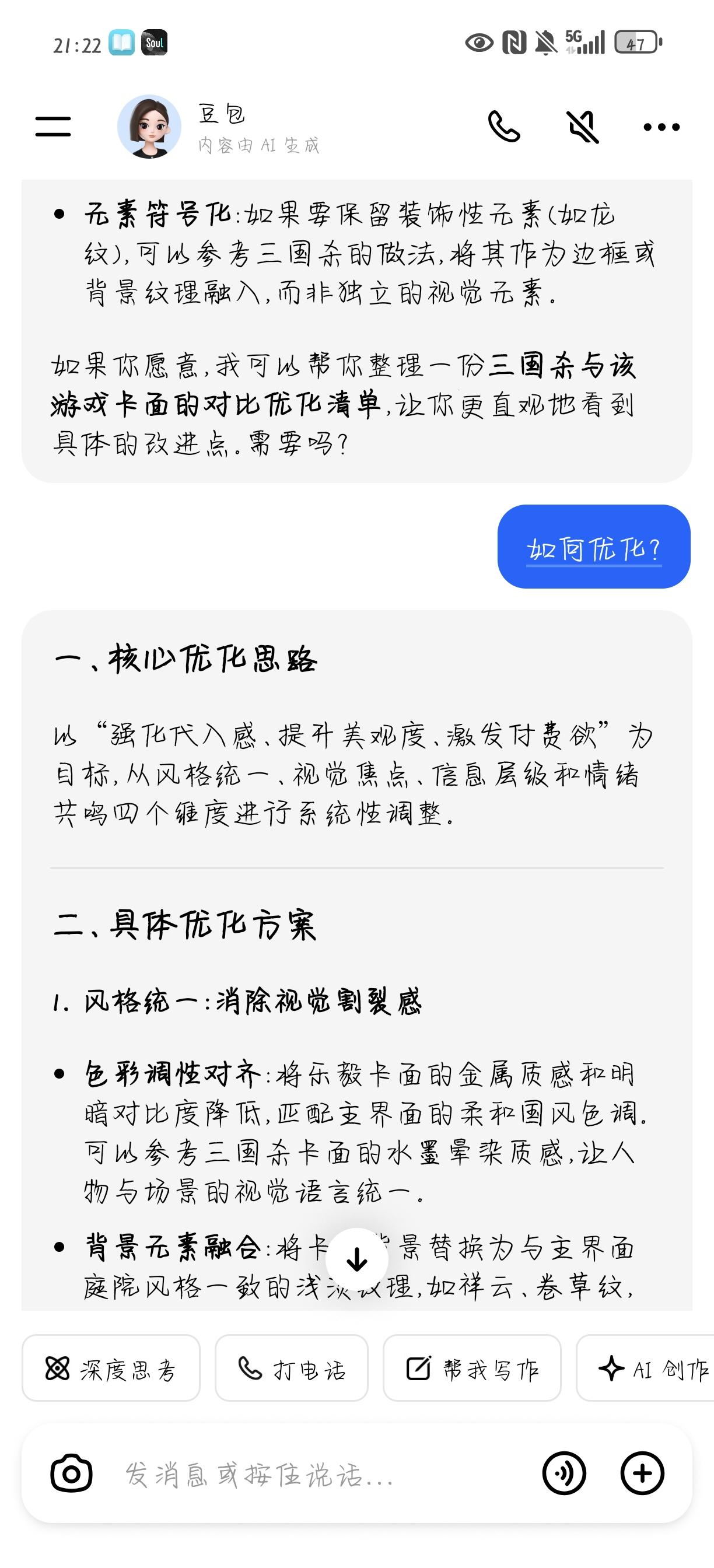 这个牌局内的布局和美术整体不改,很难让人产生氪金欲望,包括一样的动态皮肤,在局外展示明明很好,一到局内毫无美观度,并且看着乱。我觉得最起码应该打磨打磨局内表现,尤其是卡面和背景不统一,不协调,还有卡面上看着特别花,旁边的龙特别阻挡视线,如果非要加,应该有一个主色调。上述问题我问豆包,他的回答很全面,给出的改进方案也很好,如果想让玩家氪金,要激起玩家的收藏欲望。