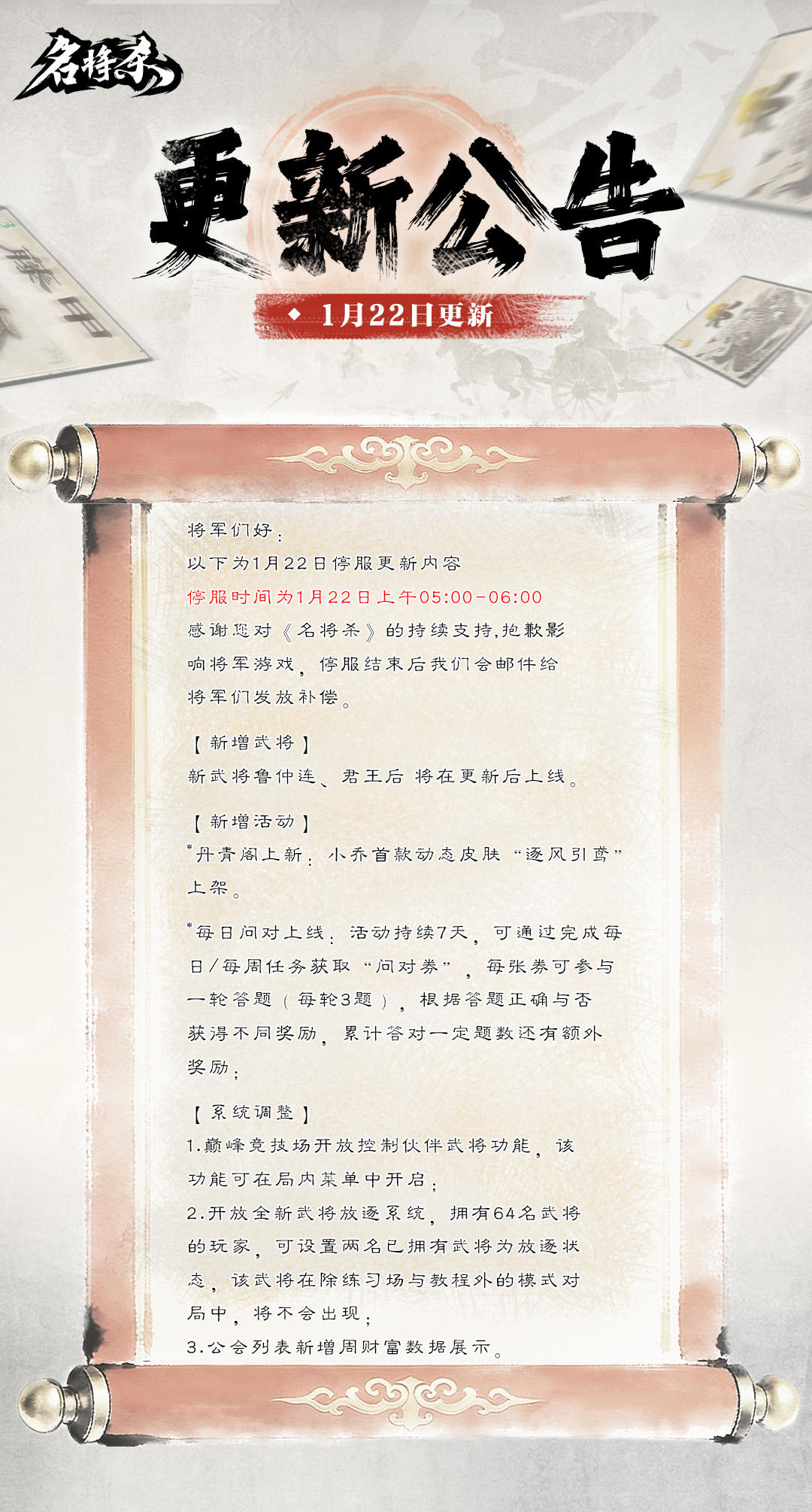 1月22日更新公告:新武将鲁仲连、君王后上线&小乔新皮肤登录丹青阁巅峰竞技场开放控制伙伴武将功能开放全新武将放逐系统