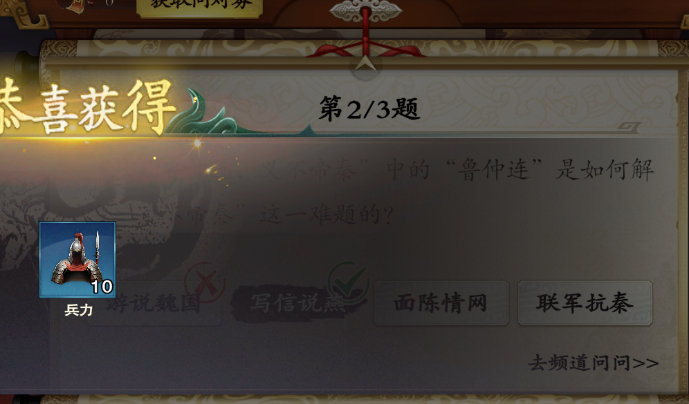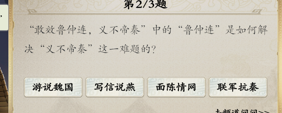 这个官方答案给的是B,我记得是A,查了一下,果然错了。附上百度讲解:义不帝秦”:公元前257年,秦军围困赵国都城邯郸,魏王派客将军新垣衍(又作辛垣衍)潜入邯郸,劝说赵王尊秦王为帝以求和。游历至赵的鲁仲连主动面见平原君与新垣衍,展开激烈辩论。他深刻剖析秦国“弃礼义而上首功”的暴虐本质,并引用齐威王不尊周、商纣残害诸侯等历史教训,指出尊秦为帝将使诸侯王及其大臣任人摆布,最终说服新垣衍放弃