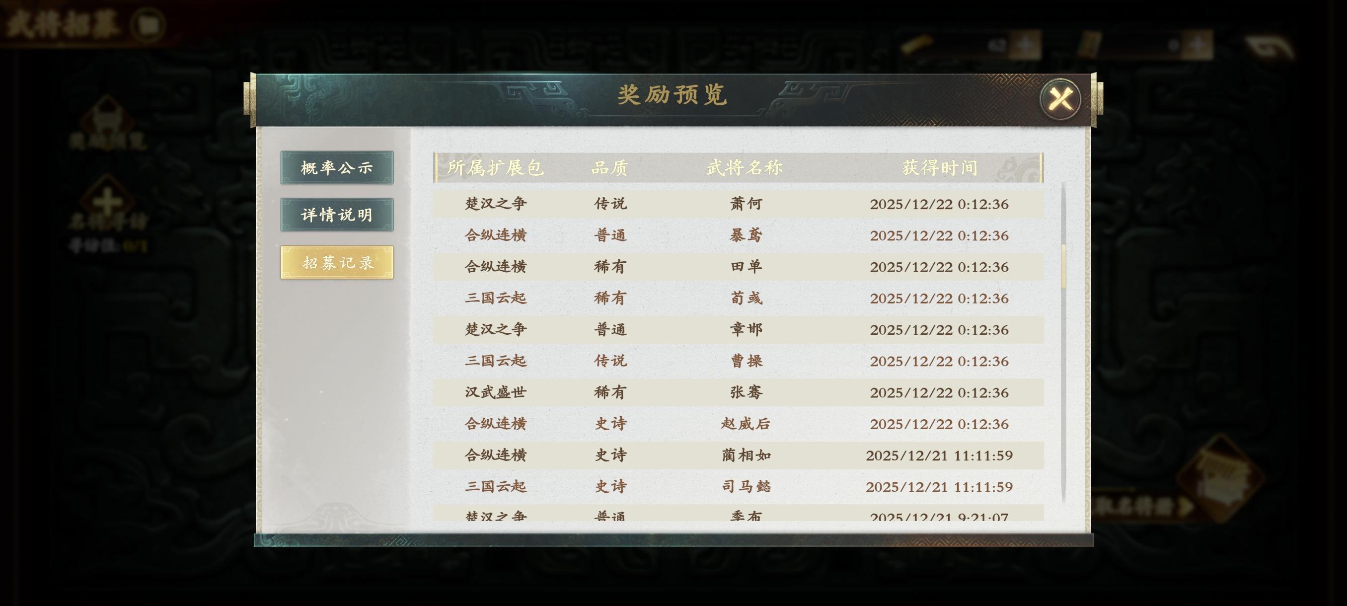 差四个签到将,不过看强度也懒得拿,之前的抽卡记录,不知道去哪了,只能看最近的记录,看我这张图就知道爆率了,20抽四个传说
