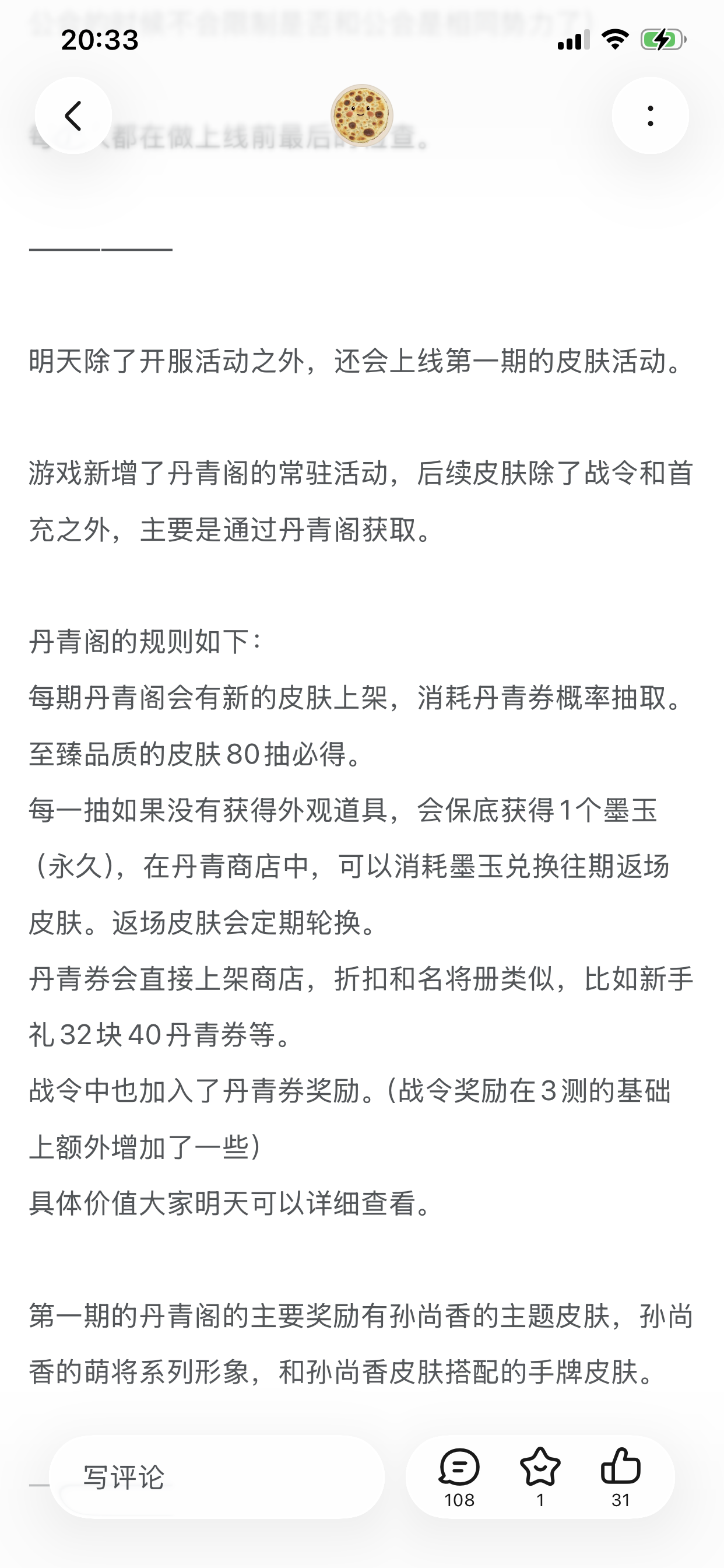 明天就要开服了,现在的我们,并没有安静的等着上线,而是忙翻天了...每个人似乎都在忙。程序老哥们已经紧急把加入公会必须势力相同的规则,改成了加入公会自动变成公会势力。(也就是申请加入公会的时候不会限制是否和公会是相同势力了)每个人都在做上线前最后的检查。——————明天除了开服活动之外,还会上线第一期的皮肤活动。游戏新增了丹青阁的常驻活动,后续皮肤除了战令和首充之外,主要是通过丹青阁获取