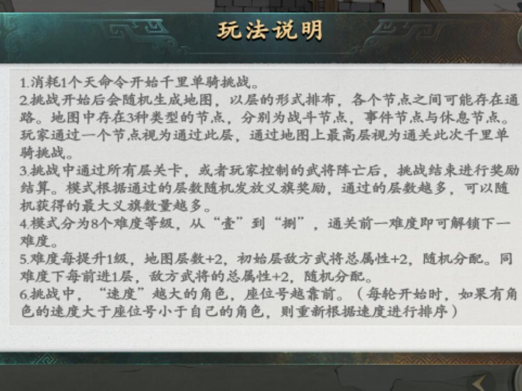 有的兄弟玩千里走单骑总是打不过,第一关就跪了,所以我这边做一个攻略(没做过什么游戏攻略,大家凑合看看吧)可以看到这个规则,里面最重要的规则就是最后一条,速度属性,速度越快出手越快我图上选择的武将是钟离昧,我主要也用的他,现在已经是第四关了,后面可能会有更合适的将这个游戏的武将有一个设定就是战役属性,这些战役属性可以用来加点,点速度阿,杀的伤害,战法伤害啥的,所以我们需要一个高阶的将,而现在这