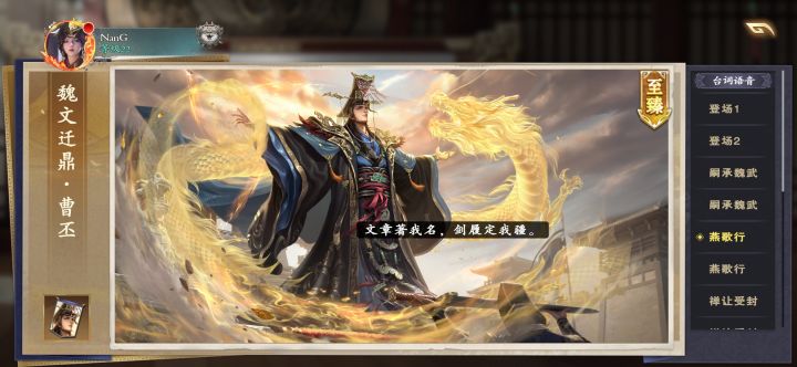 曹丕这个名将从开始没有皮肤的时候我就喜欢玩,到现在更是这样了,我感觉想把曹丕运用好很需要脑子,一般人我不告诉他,当你有了皮肤你会发现你更离不开了,主要是这个皮肤很有亮点啊,第一就是那个动态图,龙真的是点睛之笔,很霸气,第二点就是曹丕的姿势,傲视群雄的感觉,给我都整自信了