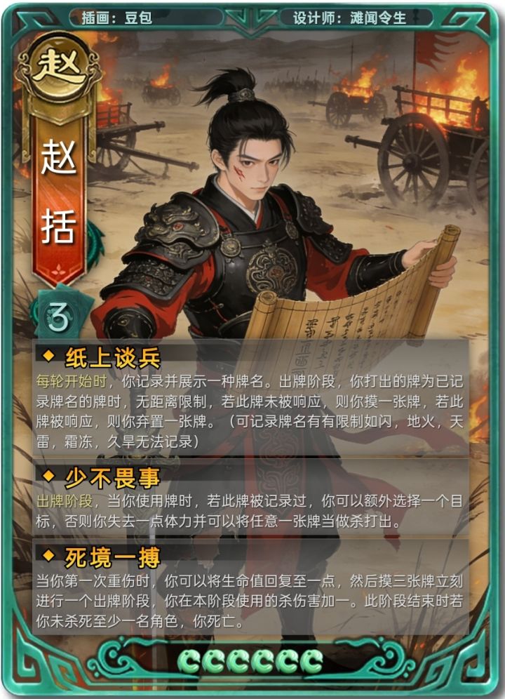 白起大将军也是以战神的姿态横扫了名将杀了,今天和朋友聊天朋友好奇名将杀会出赵括不,出了技能会是什么样的引起了我的兴趣,正好闲着设计了一下。现在和大家分享一下我设计的——白起将军的经验包,赵国最年轻的大将军,血战致死年青气盛的赵括。赵括稀有势力:赵6血3手牌纸上谈兵:每轮开始时,你记录并展示一种牌名。出牌阶段,你打出的牌为已记录牌名的牌时,无距离限制,若此牌未被响应,则你摸一张牌,若此牌