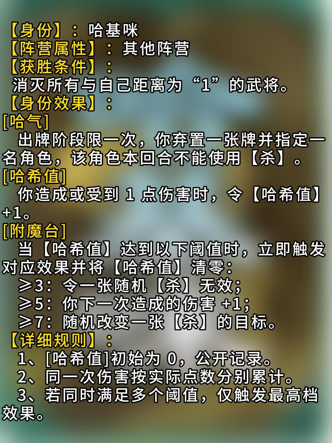 #名将杀百业天工 一、【身份】:哈基咪【阵营属性】:其他阵营【获胜条件】:消灭所有与自己距离为“1”的武将。【身份效果】:[哈气]出牌阶段限一次,你弃置一张牌并指定一名角色,该角色本回合不能使用【杀】。[哈希值]你造成或受到 1 点伤害时,令【哈希值】+1。[附魔台]当【哈希值】达到以下阈值时,立即触发对应效果并将【哈希值】清零:≥3:令一张随机【杀】无效;≥5:你下一次