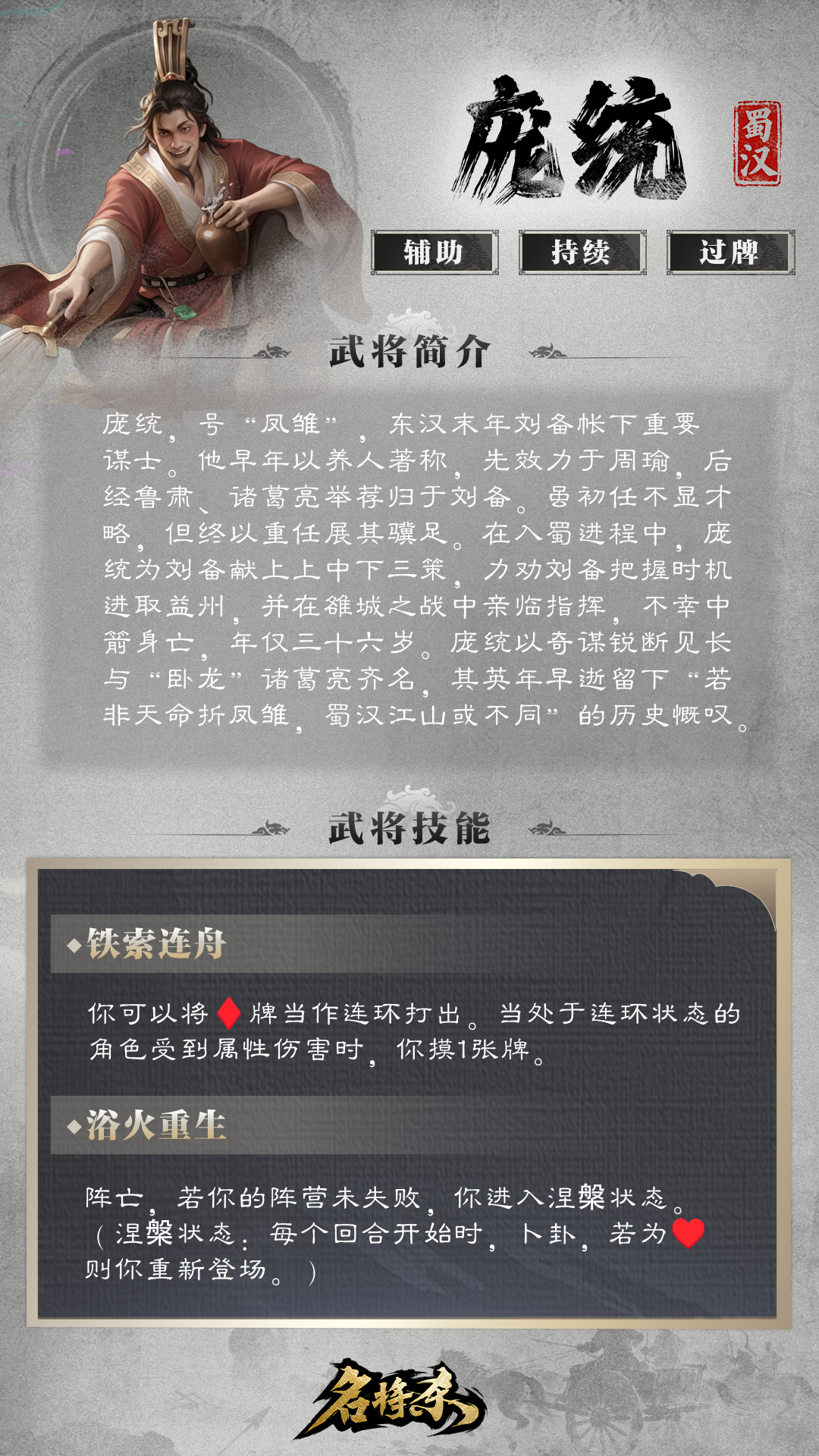 庞统 5手牌 3体力上限 蜀汉 传说铁索连舟你可以将♦️牌当作连环打出。当处于连环状态的角色受到属性伤害时,你摸1张牌。浴火重生阵亡,若你的阵营未失败,你进入涅槃状态。(涅槃状态:每个回合开始时,卜卦,若为♥️,则你重新登场。)*涅槃状态下,庞统阵亡,但是玩家不退场。*如果庞统阵亡时,自己的阵营失败了,就不会进入涅槃状态。这种情况比较多,比如2V2仅剩自己的时候,身份模式自己是最后1