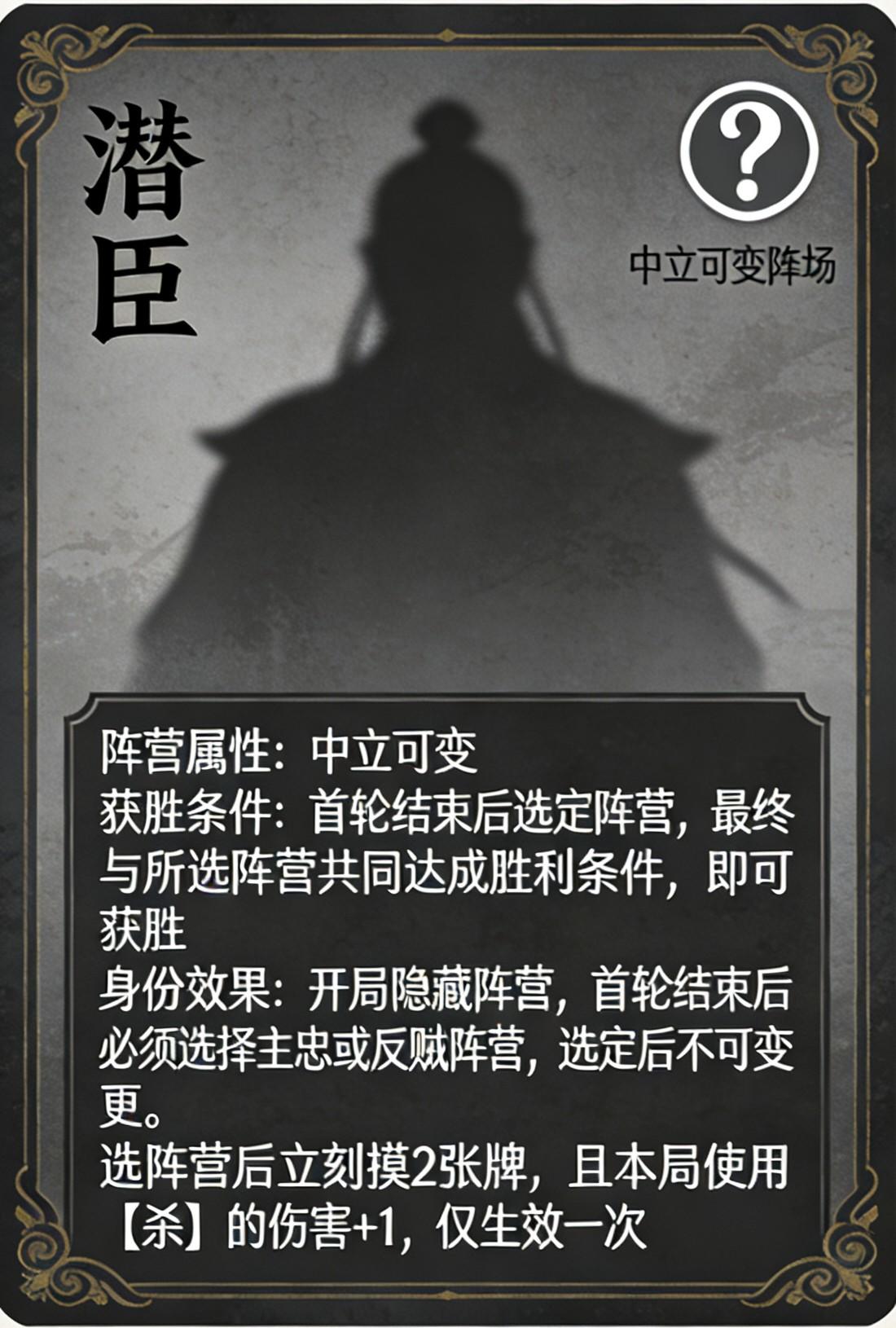 #名将杀百业天工 身份代号:潜臣阵营属性:中立可变获胜条件:首轮结束后选定阵营,最终与所选阵营共同达成胜利条件,即可获胜。身份效果:开局隐藏阵营,首轮结束后必须选择主忠或反贼阵营,选定后不可变更。选阵营后立刻摸2张牌,且本局使用【杀】的伤害+1,仅生效一次。
