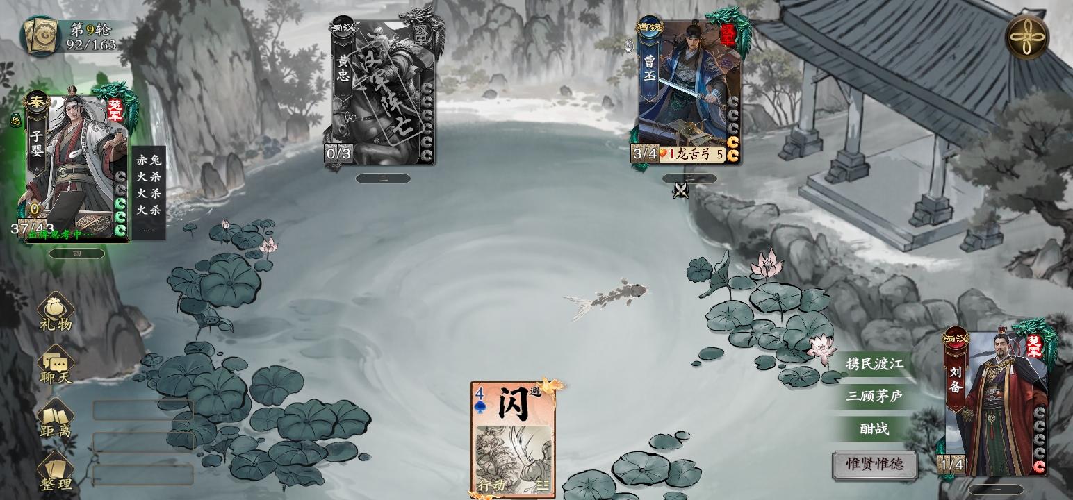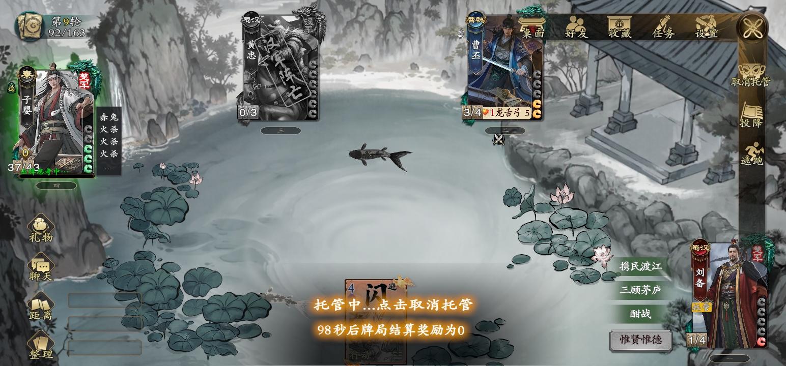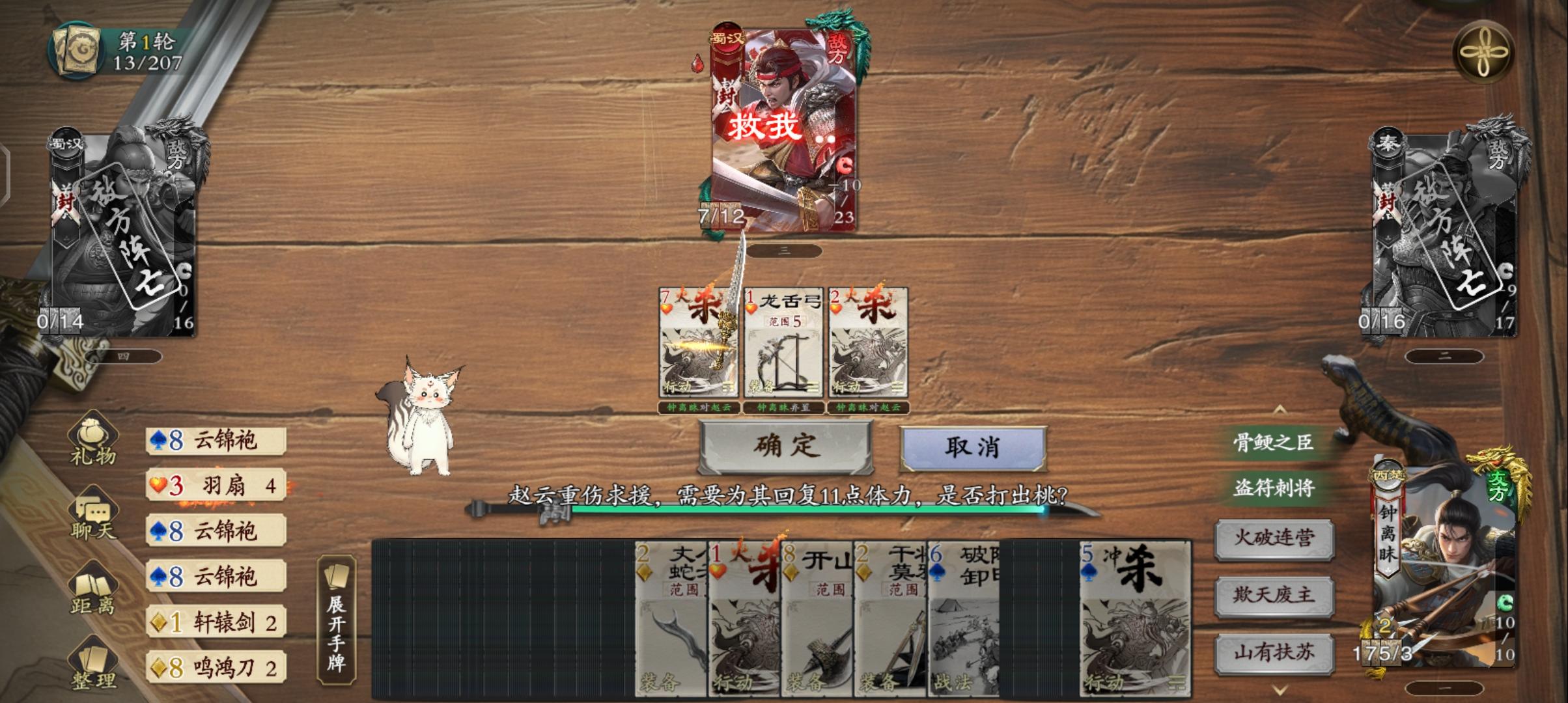 庞统 5手牌 3体力上限 蜀汉 传说铁索连舟你可以将♦️牌当作连环打出。当处于连环状态的角色受到属性伤害时,你摸1张牌。浴火重生阵亡,若你的阵营未失败,你进入涅槃状态。(涅槃状态:每个回合开始时,卜卦,若为♥️,则你重新登场。)*涅槃状态下,庞统阵亡,但是玩家不退场。*如果庞统阵亡时,自己的阵营失败了,就不会进入涅槃状态。这种情况比较多,比如2V2仅剩自己的时候,身份模式自己是最后1