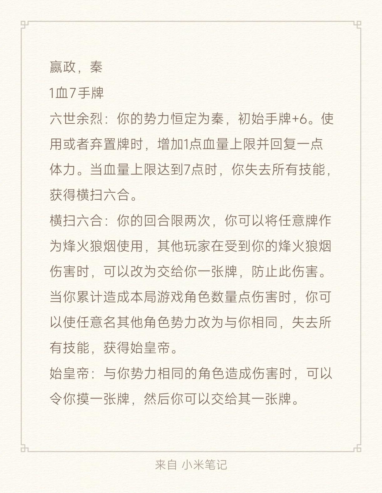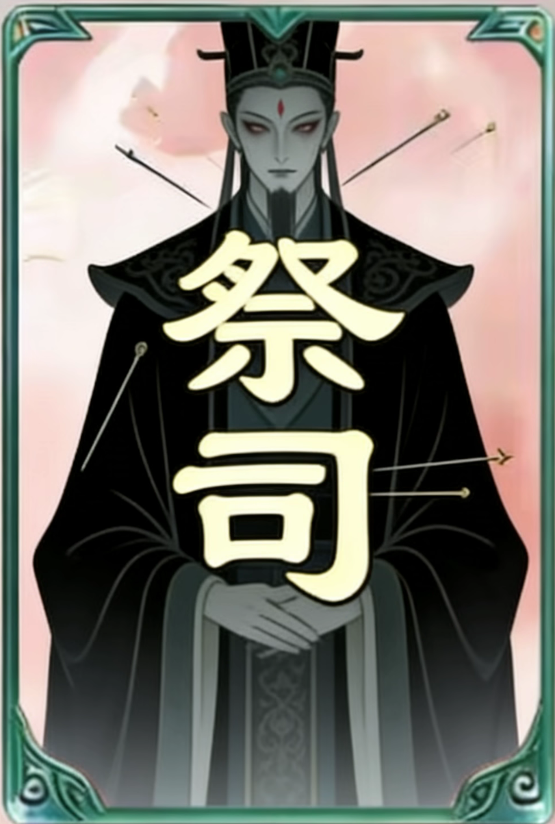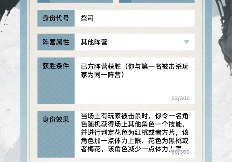设计身份 祭司 #发现好游戏 #名将杀 #名将杀百业天工 身份代号 祭司 阵营属性 其他阵营 获胜条件 已方阵营获胜(你与第一名被击杀玩 家为同一阵营)身份效果 当场上有玩家被击杀时,你令一名存活角色随机复制场上其他角色一个技能(为初始阶段),并进行判定花色为红桃或者方片,该角色加一点体力上限,花色为黑桃或者梅花,该角色减少一点体力。当有角色被击杀,祭司发动身份技能时,其他玩家只显示待祭