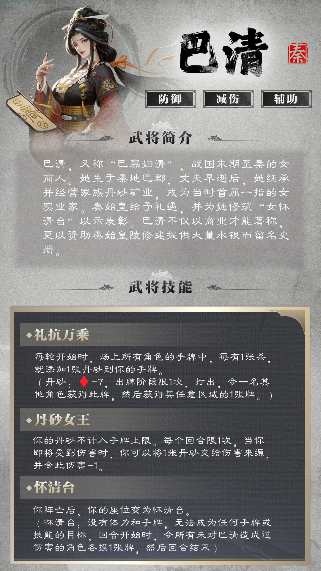 初看技能组就不难发现,老板娘在多人局显然更加拉风,毕竟,谁不想在每轮开始时“摸”一大把牌呢?作为一个正儿八经的商人,她的主要作用也正是让生产生活资料(牌)在角色与角色之间流通。丹砂这种对每位角色一视同仁的作用,使得巴清成为了军八“搅屎棍”。有她在的军八对局必然会相对混乱一点。虽然减伤和抢牌有着回合限制,但是巴清想要发挥作用就不得不主动或被动地将丹砂发出去。所以,尽管大部分丹砂仍然留在她自己手中