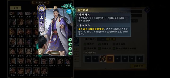 刘协 4手牌 5体力上限 东汉 传说负鼎见胁其他角色出牌阶段限1次,若其与你的距离为1,其可以交给你1张牌,然后其可以打出你的1张手牌,若此牌造成伤害,你与其摸1张牌。衣带诏限定,你可以选择一名其他角色,令所有其他角色与其的距离始终为1。当其受到伤害时,伤害来源角色摸1张牌。当其阵亡时,你获得其所有牌,并且重置此技能。刘表 4手牌 5体力上限 东汉 稀有自守待时每回合每种花色限1次,