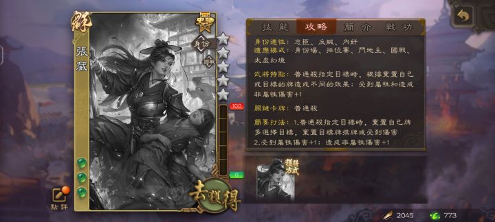 刘协 4手牌 5体力上限 东汉 传说负鼎见胁其他角色出牌阶段限1次,若其与你的距离为1,其可以交给你1张牌,然后其可以打出你的1张手牌,若此牌造成伤害,你与其摸1张牌。衣带诏限定,你可以选择一名其他角色,令所有其他角色与其的距离始终为1。当其受到伤害时,伤害来源角色摸1张牌。当其阵亡时,你获得其所有牌,并且重置此技能。刘表 4手牌 5体力上限 东汉 稀有自守待时每回合每种花色限1次,