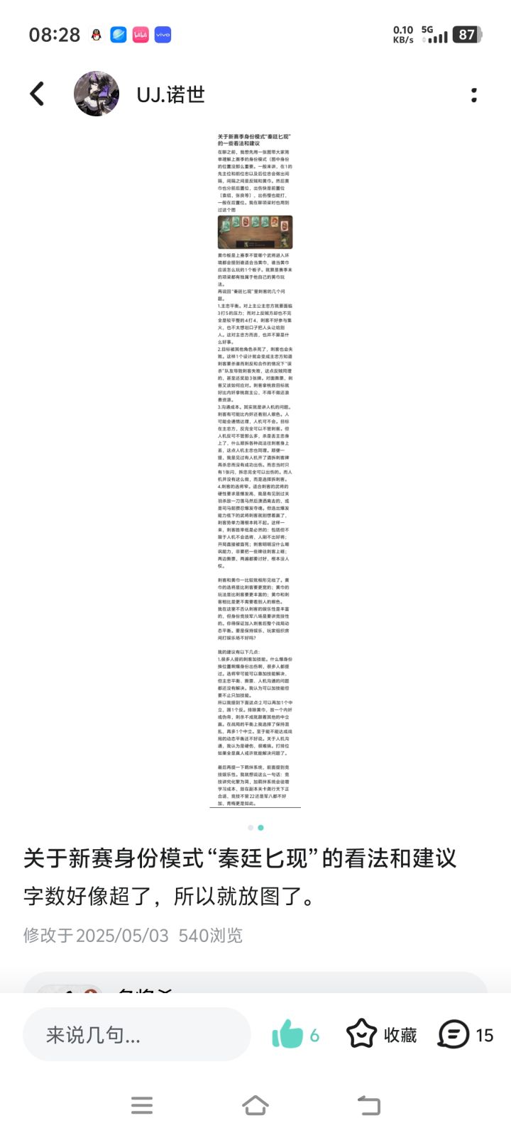 1持续完善新人指引方面的问题需要不断吸引新的血液2伙伴可以拖动,点击,甚至局内把原有的伙伴指令做饭点击他呼出指令3聊天框里可以艾特别人4一步步限制身份场嘴牌,最近刺客局排位有人开局就问身份的,可以局内部分词汇不让说5持续产出优质皮肤,皮肤单独列出来是因为我实在不喜欢你们现在做的皮肤,以后有机会出一些优质的立绘,尤其写实风格,比如像最近秦始皇的刺绣这种,然后其他画风,现在的人有的有点卡通我不