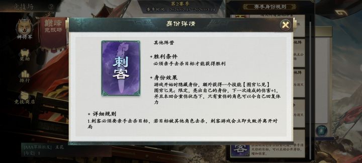 去年5月份“秦廷匕现”身份玩法正式上线代号杀的赛季身份场(此时是代号杀),上线时我就有做出自己的看法和建议,可以看看当时的帖子或文图。而后策划的做法是再加1个刺客以及加技能再是后续的再一次开服让玩家人数变多,“秦廷匕现”身份玩法的也迎来了一次回归,风向又一次变成了3打5。上回是主反随机3打5,这回是反贼3打5。原因还是出在刺客的胜利条件,他有一个大前提,主一死游戏结束就什么都完成不了。主忠方任
