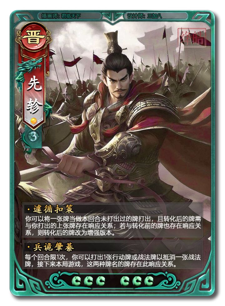 羊祜 西晋 3/6增修德信:当你回复体力值时,令1名其他角色摸2张牌;当你获得牌时,令1名角色回复1点体力值。堕泪碑:当你阵亡时,弃置场上所有角色的♠️牌,然后令1名其他角色摸弃牌总数张牌。