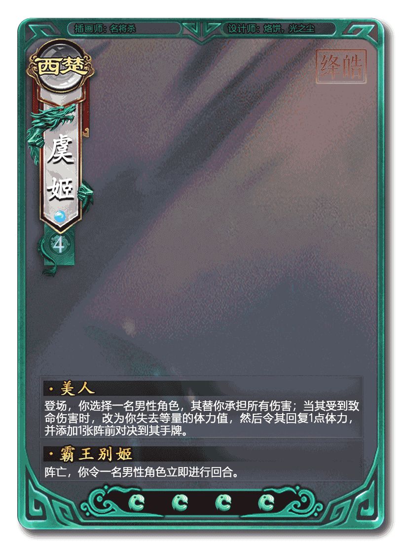 高渐离 5手牌 4体力上限 燕 稀有击筑而歌当你打出牌时,若此牌与你当前回合打出的前1张牌的点数不同,可以弃置一名其他角色的1张牌;若点数相同,则你摸1张牌,并且此技能失效直到当前回合结束。变徴之声当你打出牌时,若此牌与你当前回合打出的前1张牌的花色不同,则你可以弃置所有手牌,并摸等量牌;若花色相同,则你摸1张牌,并且此技能失效直到当前回合结束。壮士去兮阵亡,你可以对一名其他角色打出弃