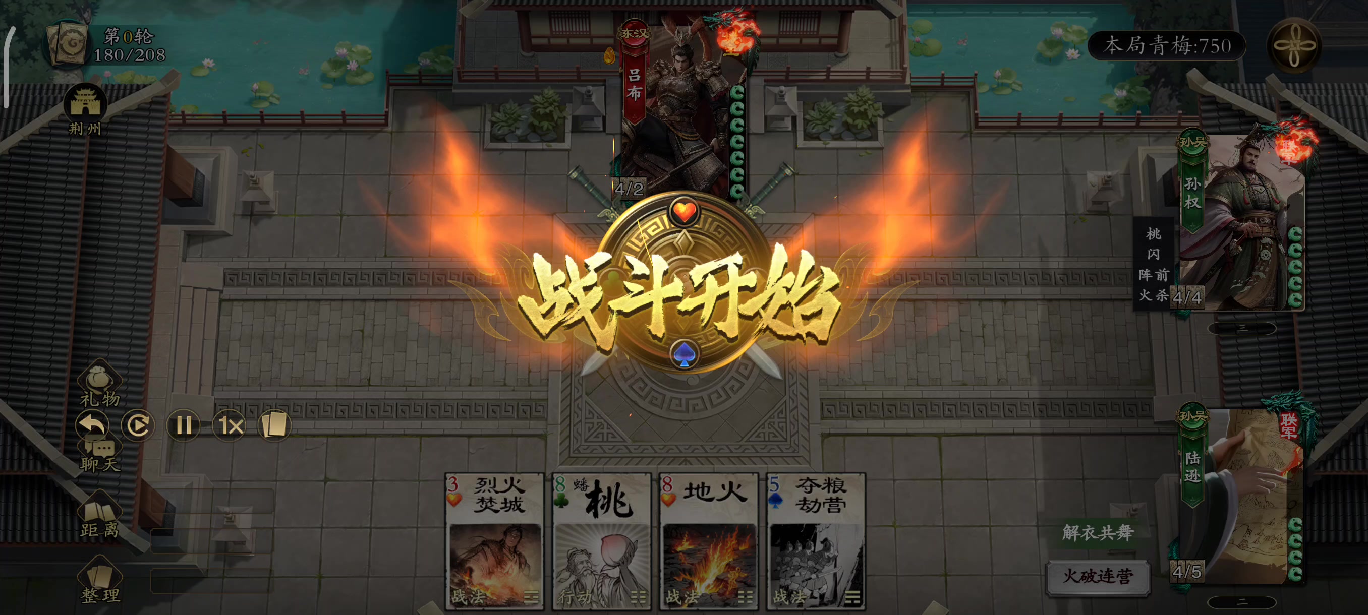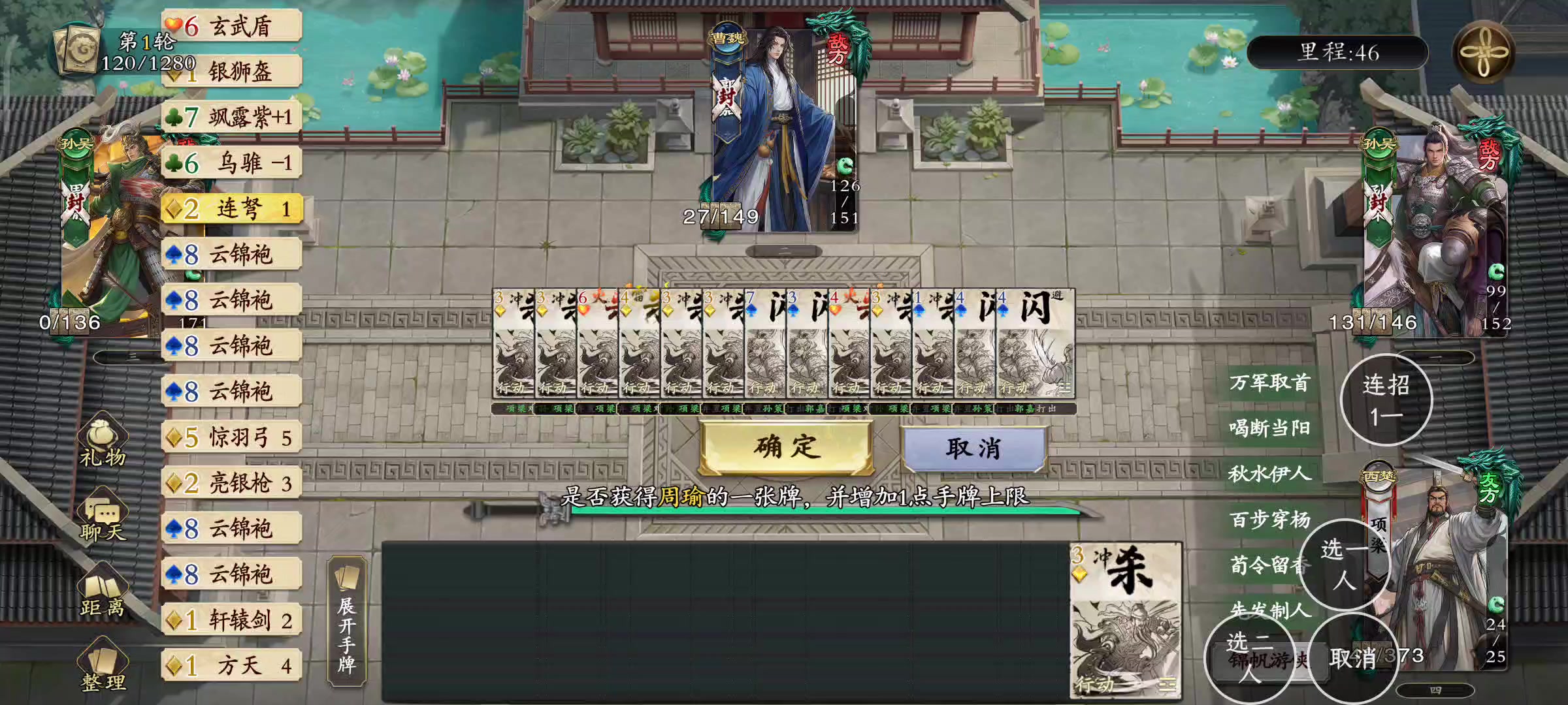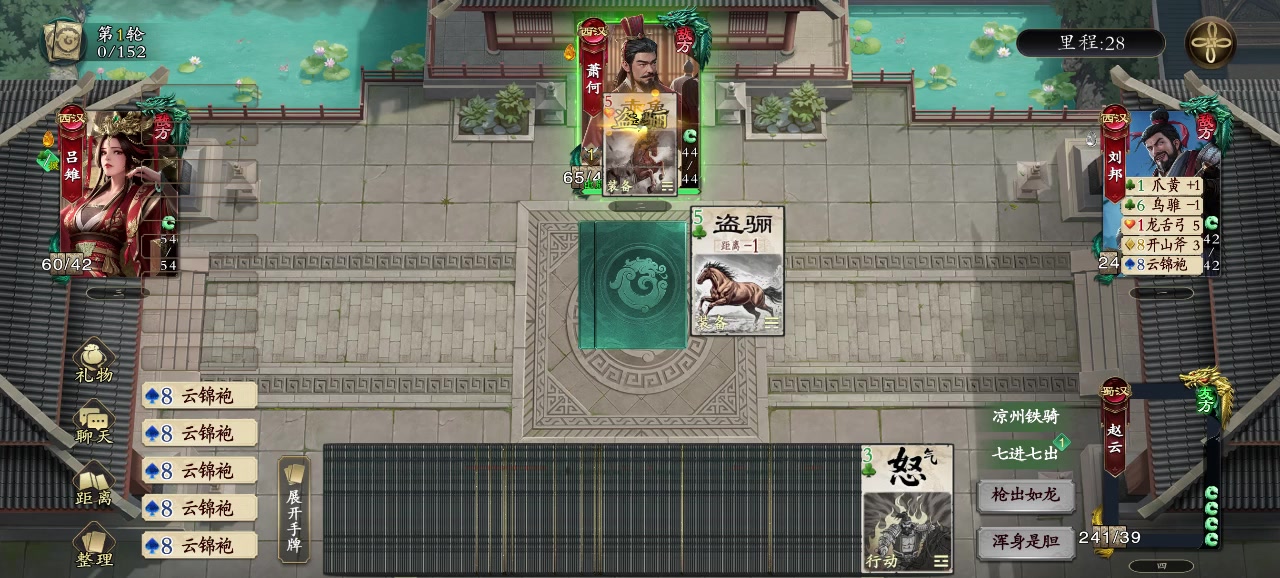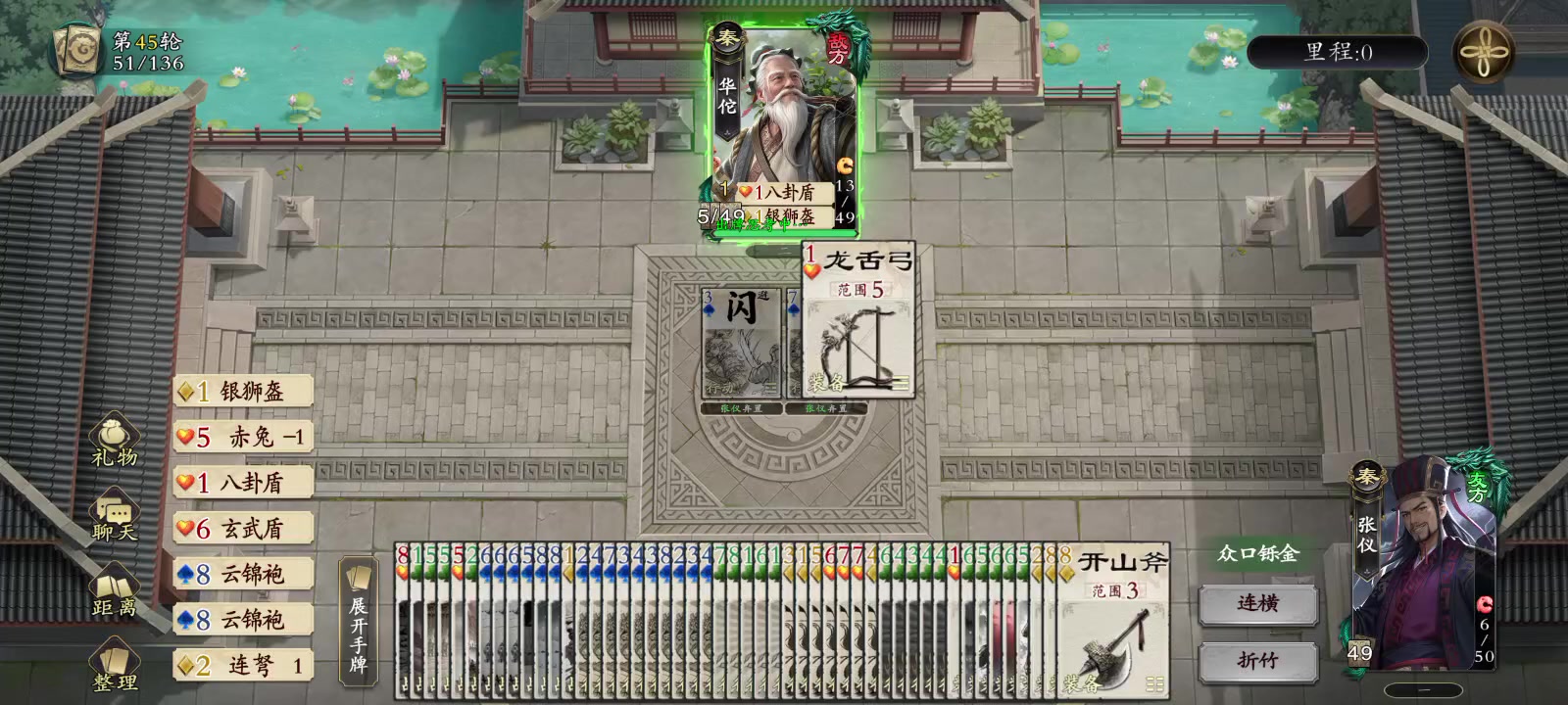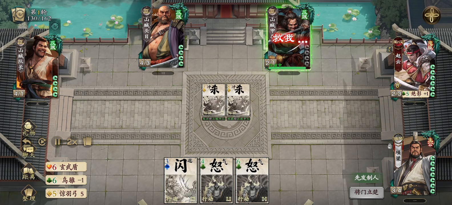 如果我有金诸弩,那就真是全自动了。 没有的话,注意对面血量,挂机自动开方天画戟的,不能让座位后面的先死。 如果后面先死,进入一号位回合,那么最好手里有20张左右识破,防止装备没了。 对面牌库上限就162张,不管他们能摸多少留多少,单次牌库就162张。所以,开局一号位摸完162张,其他人就没手牌了。 开局先攻伤害基本上就是杀的伤害加上杀牌数量,视频里差不多能有2万点伤害。 人机血量怎么可能比得上我刷