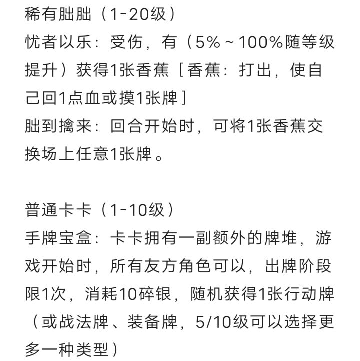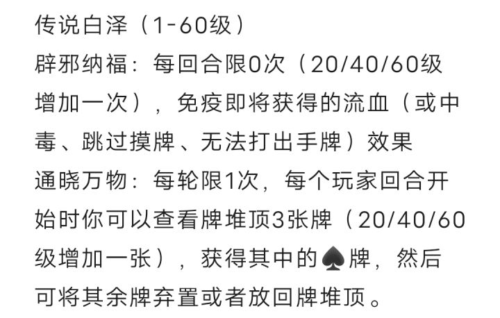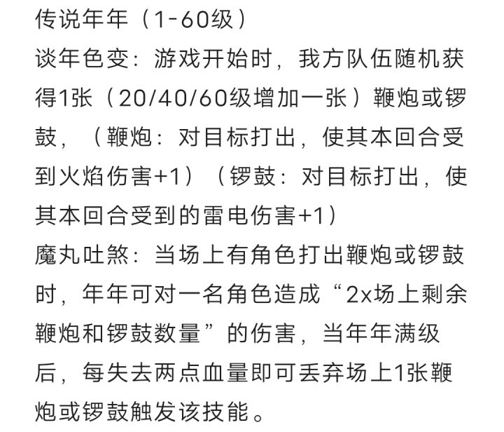 宠物最高64级。传说4个技能,史诗3,稀有2,普通1。每8级提供1个六合点数,传说一共提供8个点数(可自己选择加点,通过削刀重置)年年一、烈火噬心(8级解锁)你造成的火焰伤害+1(40级变为+2)二、紫薇星祀(16级解锁)回合开始时,添加1张随机红桃牌到你的手牌(48级变为2张)三、五谷载祭(24级解锁)你受到伤害时,可以对一名其他角色造成1点火焰伤害(56级变为2点)四、岁岁年年