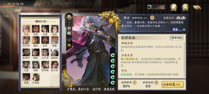 组队有配合挺强,比如诸葛亮、子婴、刘备、芈八子、鲁仲连、庞统…没配合单出的话每回合大概额外2牌的收益,基本不考虑单出了。或者1号位限定,起手刷2-3张锦囊牌。中规中矩。没配合的话,可能特别区