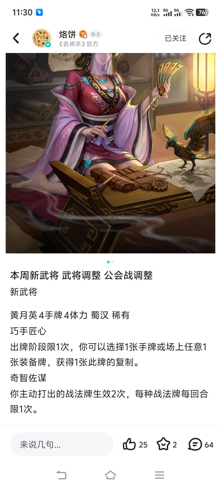 新武将黄月英 4手牌 4体力 蜀汉 稀有巧手匠心出牌阶段限1次,你可以选择1张手牌或场上任意1张装备牌,获得1张此牌的复制。奇智佐谋你主动打出的战法牌生效2次,每种战法牌每回合限1次。王异 4手牌 4体力 曹魏 稀有忠贞刚烈回合结束时,你可以令一名其他角色的手牌数或者体力值变为与你相同,若其手牌数或者体力值因此改变>=2,你受到1点伤害。 舍子全义受伤,令一名角色弃置所有手牌,
